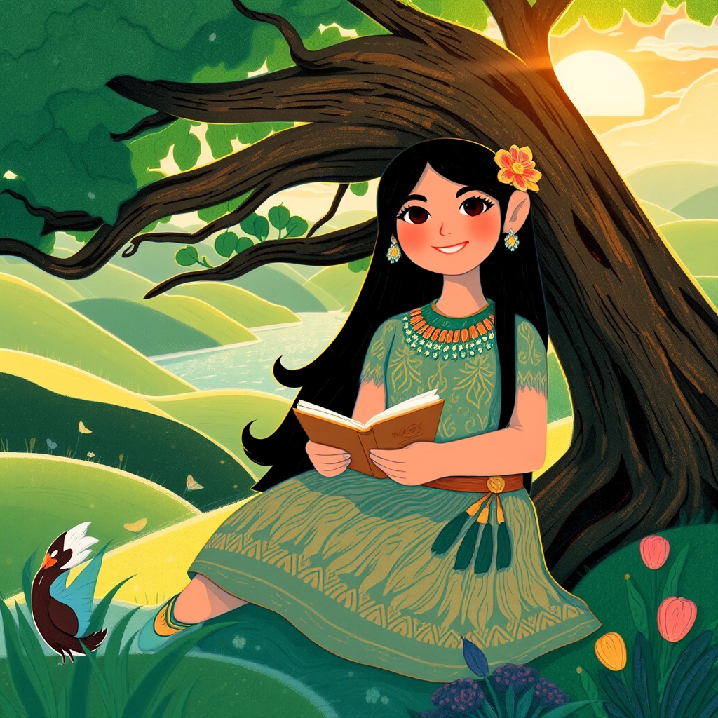 Long ago, in the beautiful lands of Aotearoa, there lived a cheerful and happy girl named Princess [Hinereikura Te Iriwaho Kararaina Riria Terere-Mihaere](T9H4B3LM). She loved to dance, sing, and read under the wide, open sky.