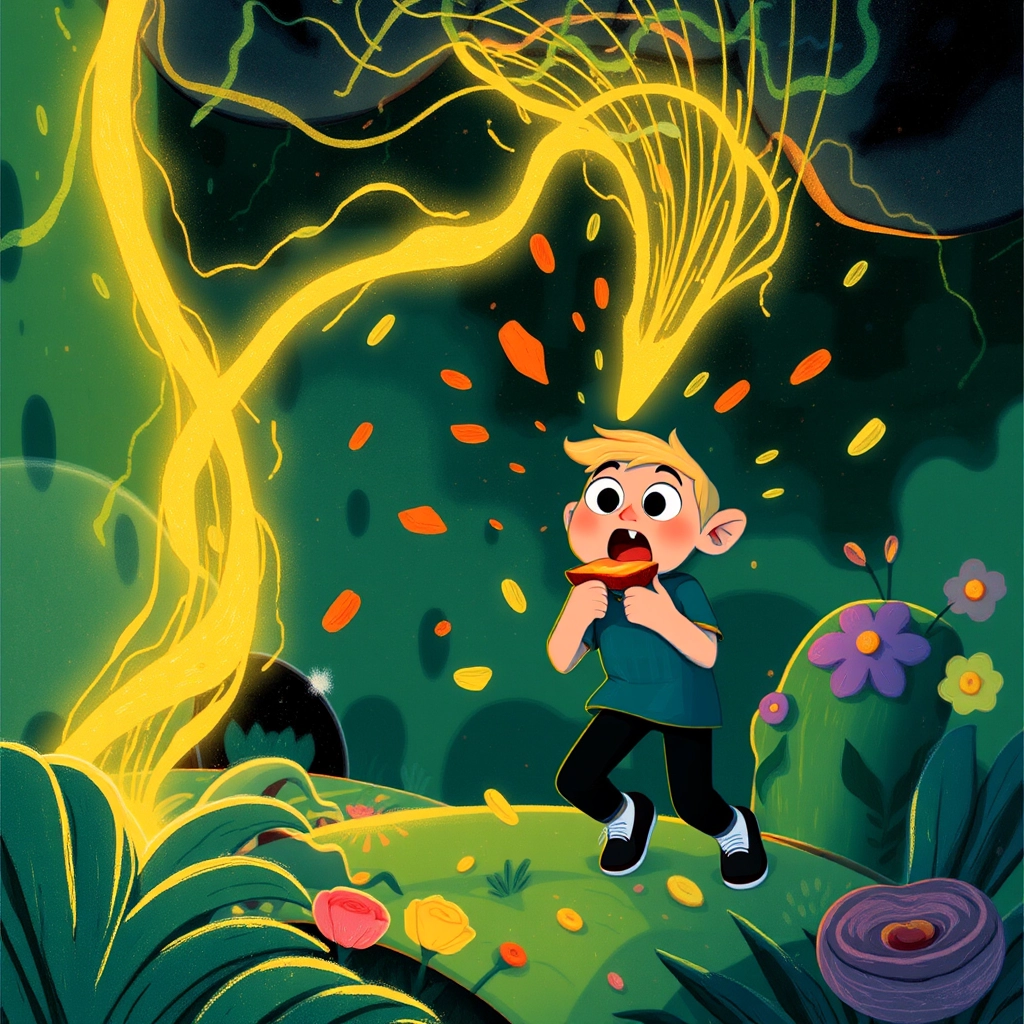 Just as Harold took a huge bite of the carrot cake, a net made of magical vines sprang up from the ground and trapped him! ‘What?!’ Harold squeaked in surprise.