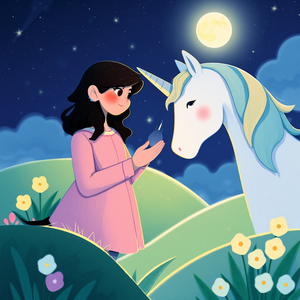 [Prisha](NCVFJCVW) couldn’t believe her eyes. She took slow steps toward the unicorn, who tilted its head curiously but didn’t move away. She held out her hand, and the unicorn gently nuzzled her palm.