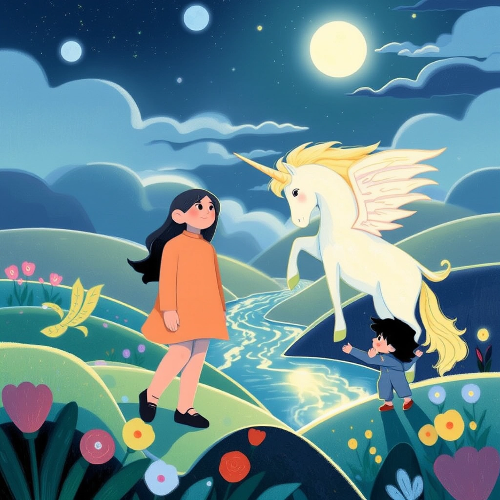 Eventually, she emerged into a beautiful meadow where moonlight glistened on a still river. On the far side of the meadow stood a majestic unicorn, its golden mane shimmering like sunlight, and its violet eyes sparkling.