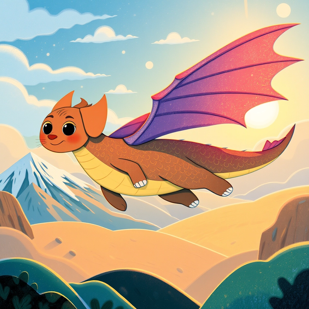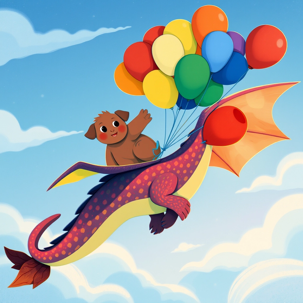 The dragon spoke in a voice as soft as a breeze. 'Hello, little one! My name is [Solara](P7ZWSVB5). Would you like to join me on an adventure?' [Paws](NTV9BYDT) wagged his tail excitedly and barked, 'Yes, please!' [Solara](P7ZWSVB5) gently scooped [Paws](NTV9BYDT) onto her back with her tail, and up they soared into the sky.