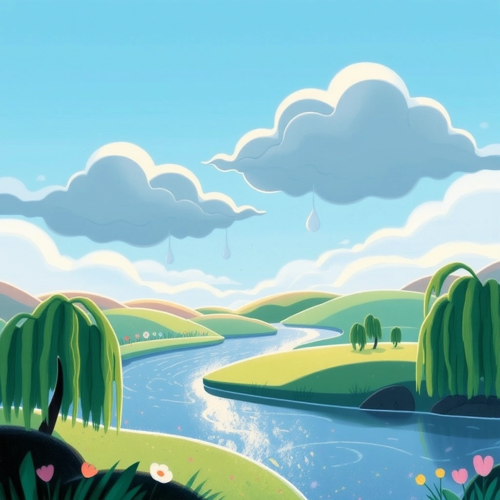 When they reached the river, [Raindrop](TXX44HHB) saw two big, gray clouds drifting quietly in the sky. 'Mom! Dad!' he called out happily.