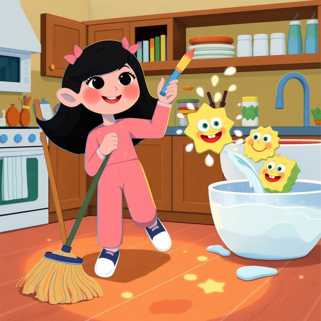 One day, her Mumma was feeling tired after a busy day. [Rajvi](SHKC9WK7) had an idea—why not use the magical pencil to help make the house shine? First, she drew a broom that swept the floors on its own and a sponge that scrubbed the dishes while singing!