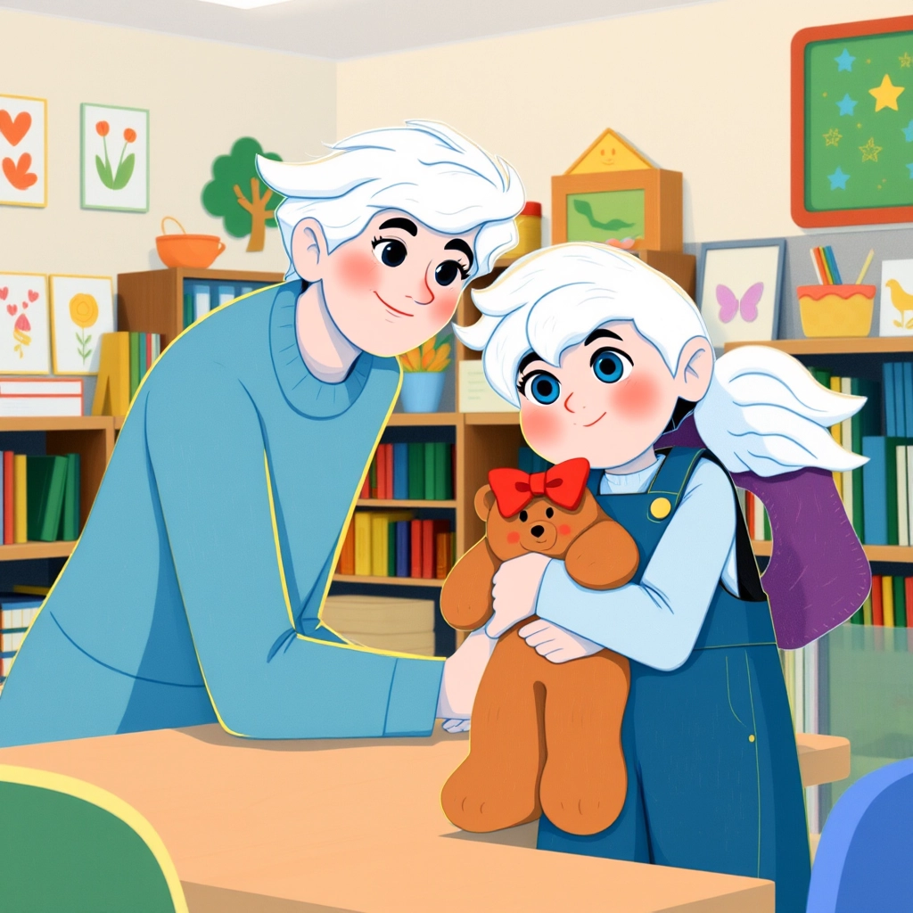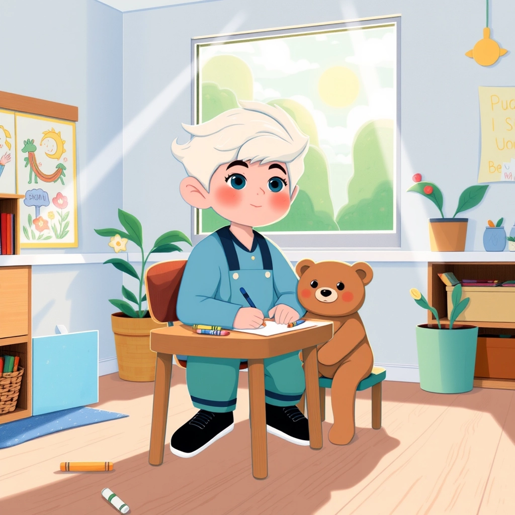 In class, he always chose the same chair. It was his spot for listening, drawing, and learning new things. Teddy sat right beside him, watching quietly.