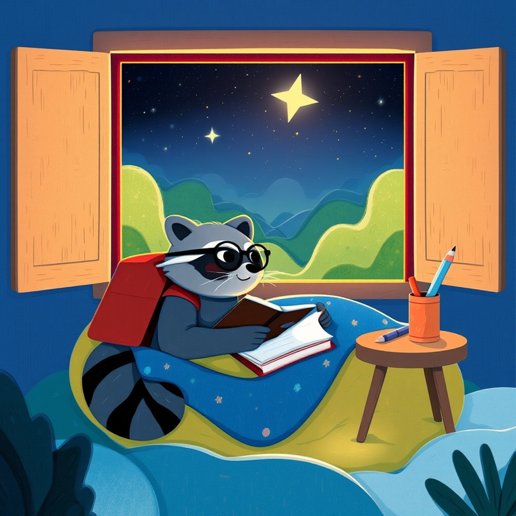 [Rémy](YDGTZSHH) the raccoon loved the night—when the world turned quiet and the stars came alive. With his trusty journal in hand, he set out under the moonlight to explore his surroundings, eager to learn something new.