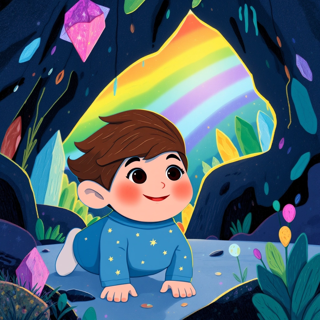 [Ricky](SNXHNNJN) crawled deeper into the cave and discovered a huge rainbow arching above him! Secretly tucked inside the rainbow were treasures: shining gold stars and twinkling jewels. "This must be where the rainbows sleep!" thought [Ricky](SNXHNNJN).