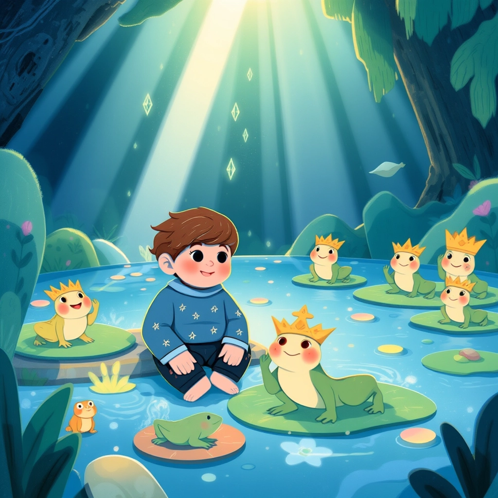 In the middle of the forest, [Ricky](SNXHNNJN) found a glittering pond. The water sparkled like diamonds, and frogs with tiny crowns hopped along its edges. "Hello, [Ricky](SNXHNNJN)!" said one frog. "Would you like to go on an adventure?"