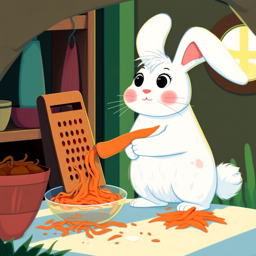 First, she grated the carrots carefully using her little wooden grater. She hummed a cheerful tune as she worked.