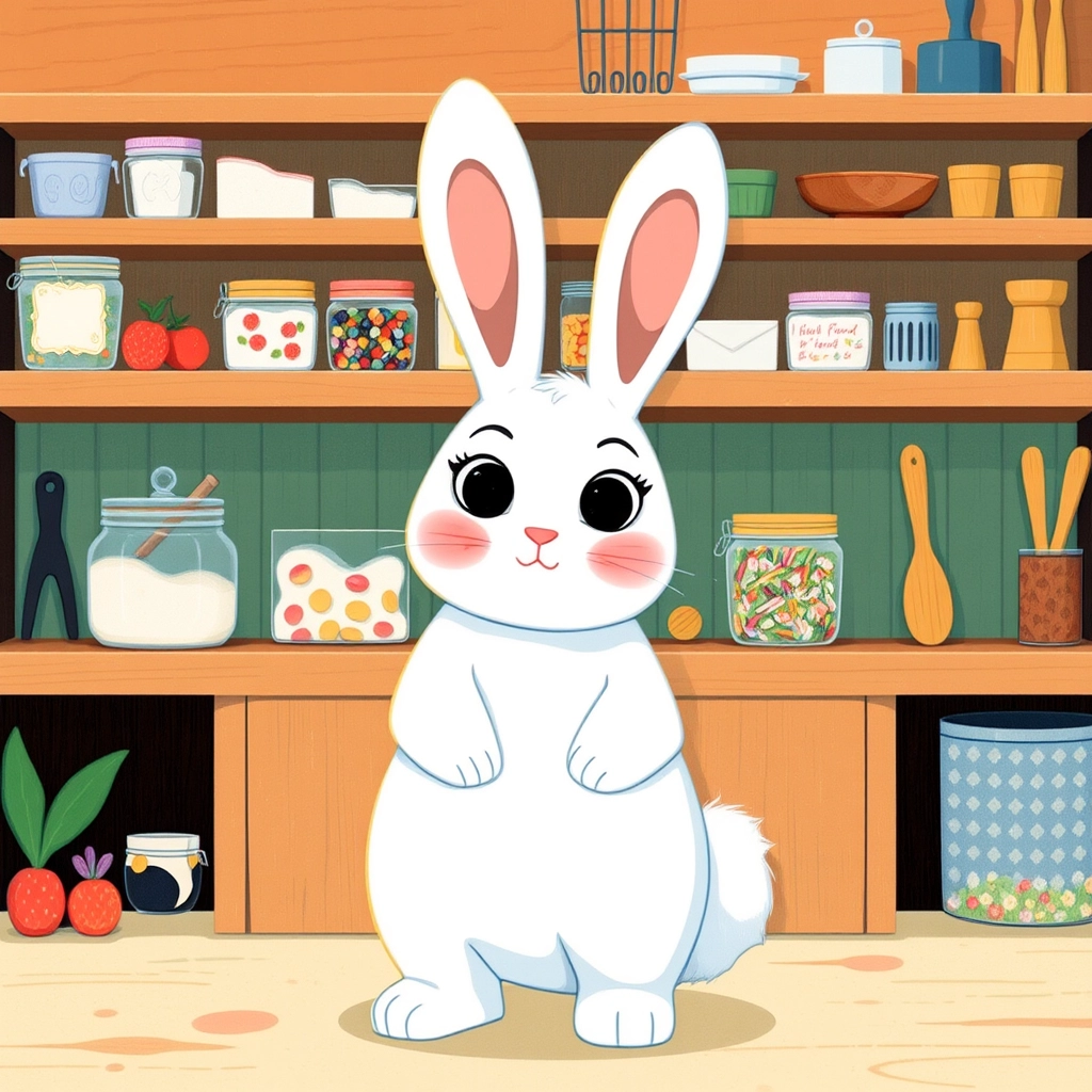 [Rini](7XJK5L9W) hopped over to her tiny kitchen, where jars of colorful ingredients were neatly lined up. 'What should I bake today?' she wondered aloud, her soft pink nose twitching in thought.