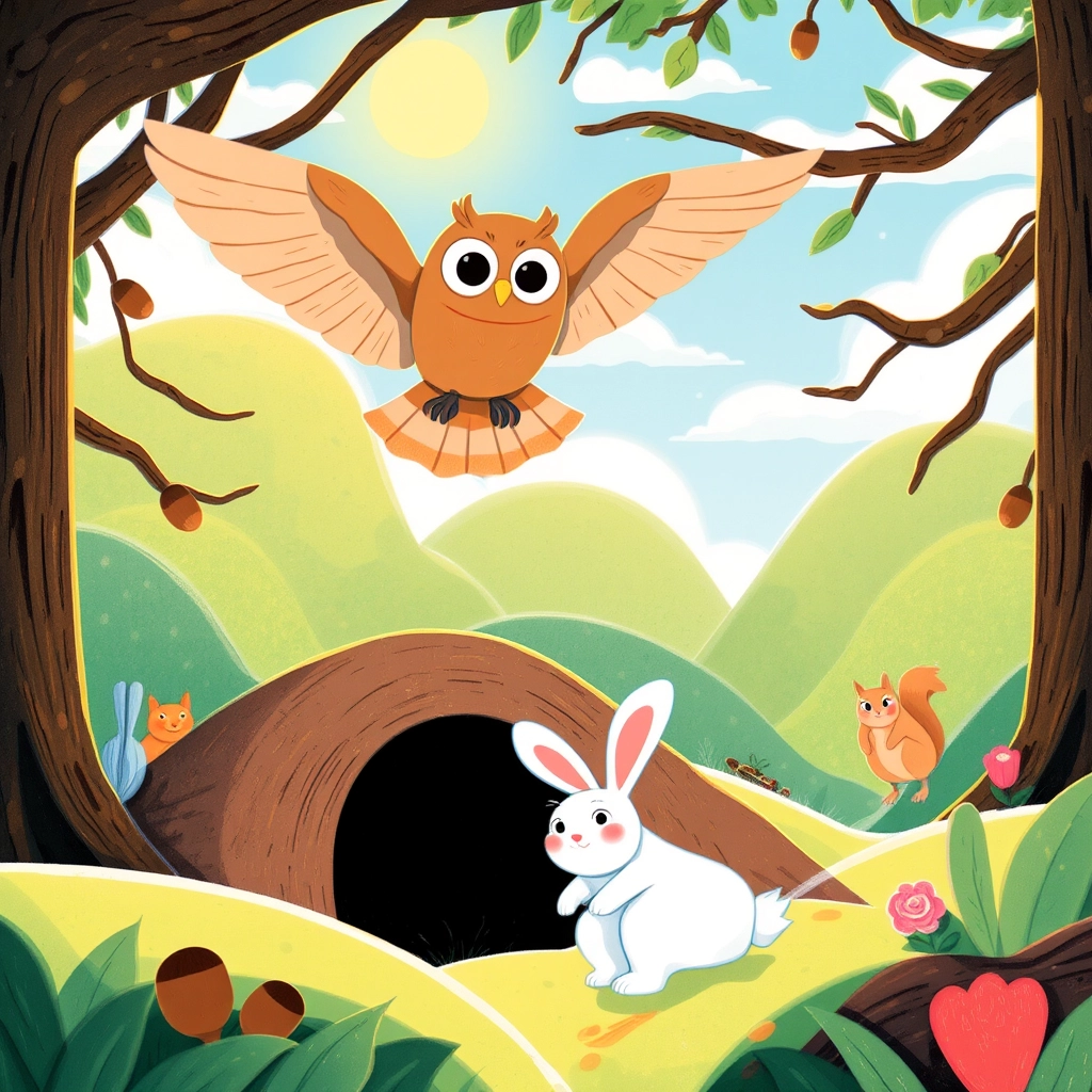 Suddenly, [Rini](7XJK5L9W) heard a laugh. She peeked out and saw [Ollie](3NLR436S) the owl, her friend, practicing flips in the air. [Rini](7XJK5L9W) stretched and hopped outside, curious about what [Ollie](3NLR436S) was up to.
