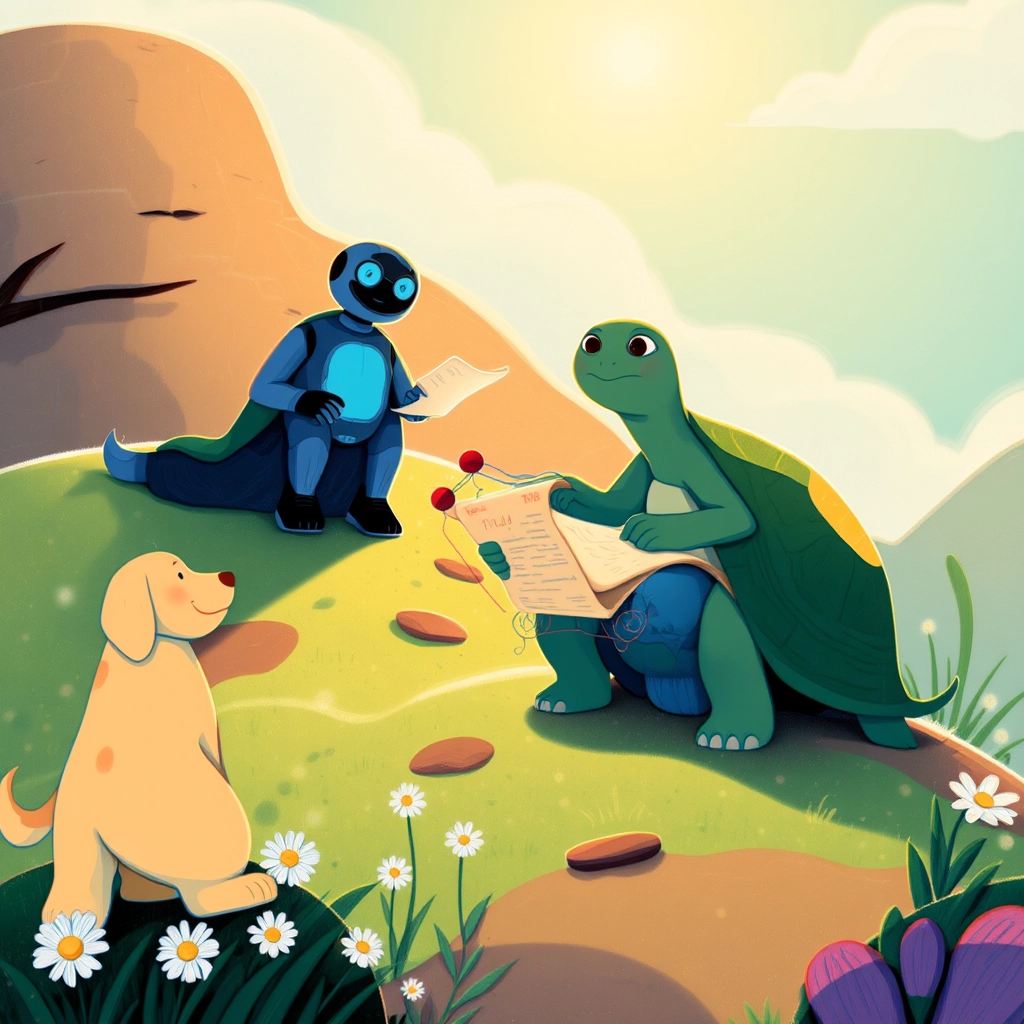 On a sunny morning in a quiet town, a shiny blue robot named [Chip](756CWQQW) decided to explore the world outside its workshop. His best friend, a golden retriever with soft, floppy ears named [Buddy](NHTJJH7S), wagged his tail excitedly, ready to join the adventure.
