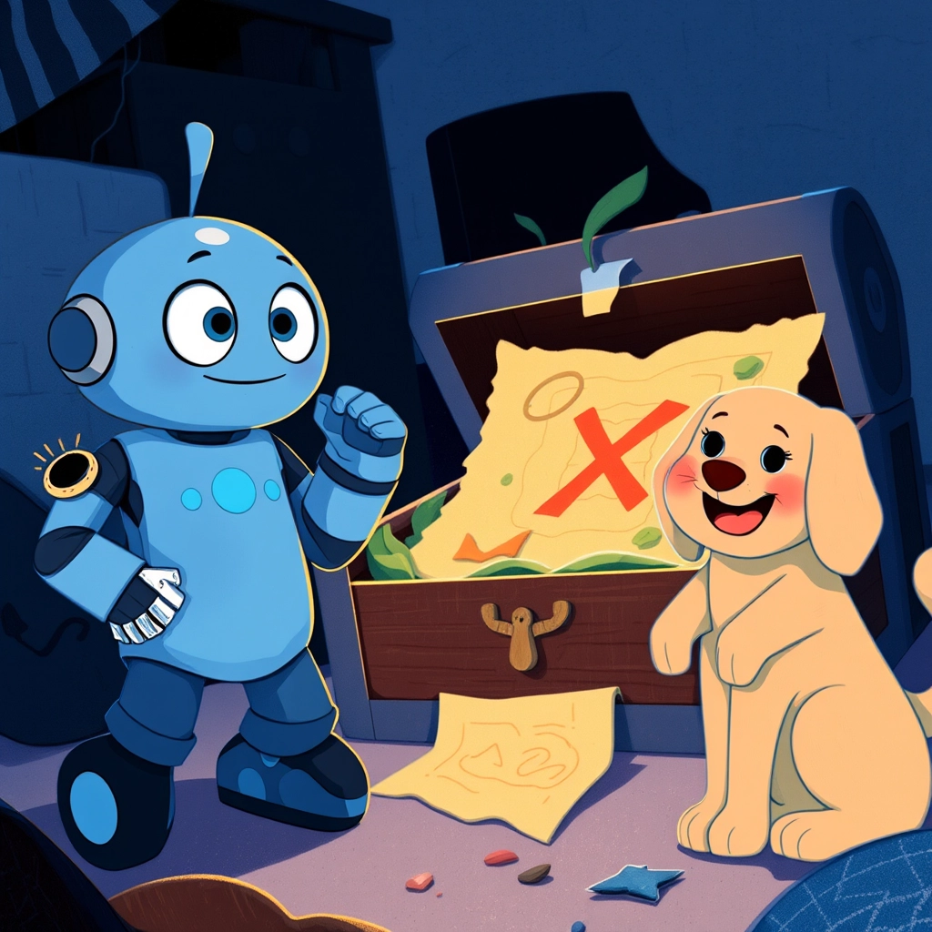 As [Chip](756CWQQW) turned the golden key, the chest popped open, revealing a map with a big red 'X' mark! 'An adventure map!' exclaimed [Buddy](NHTJJH7S) with an excited bark.