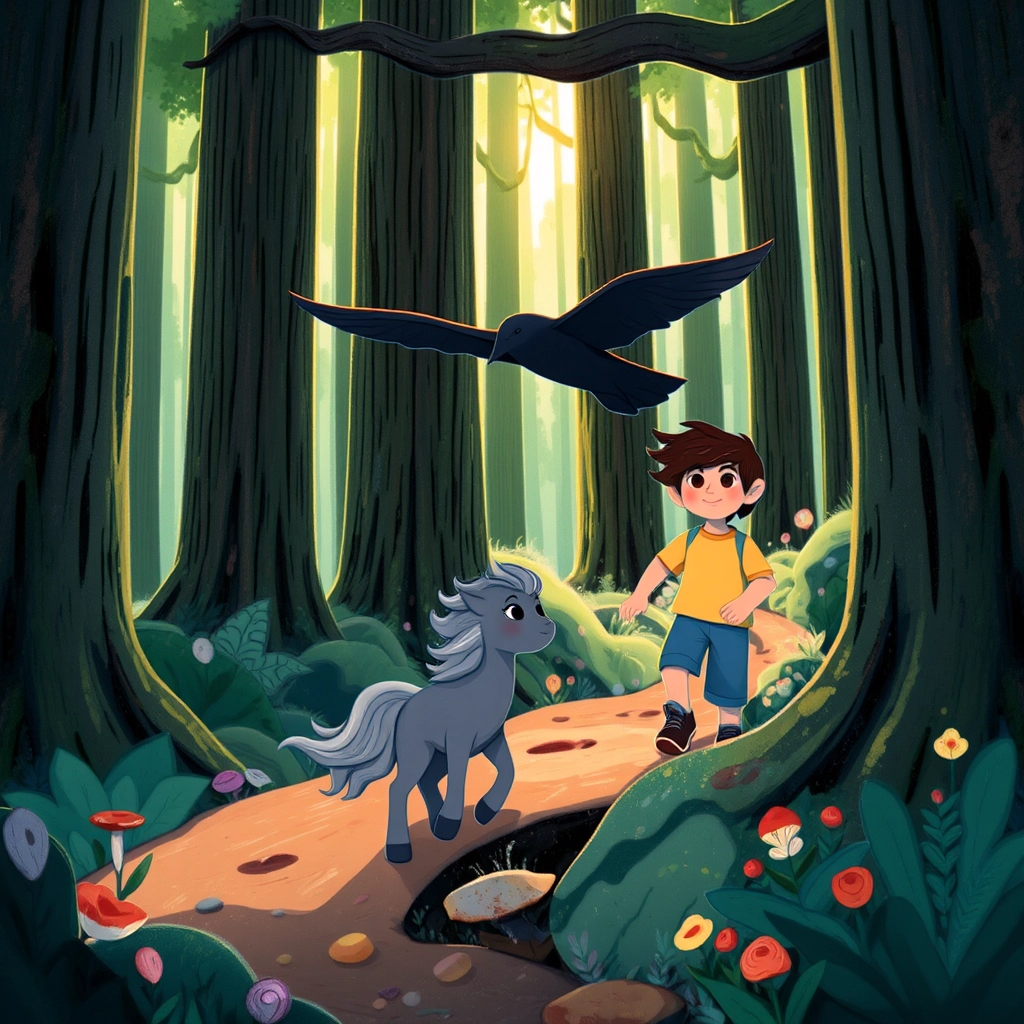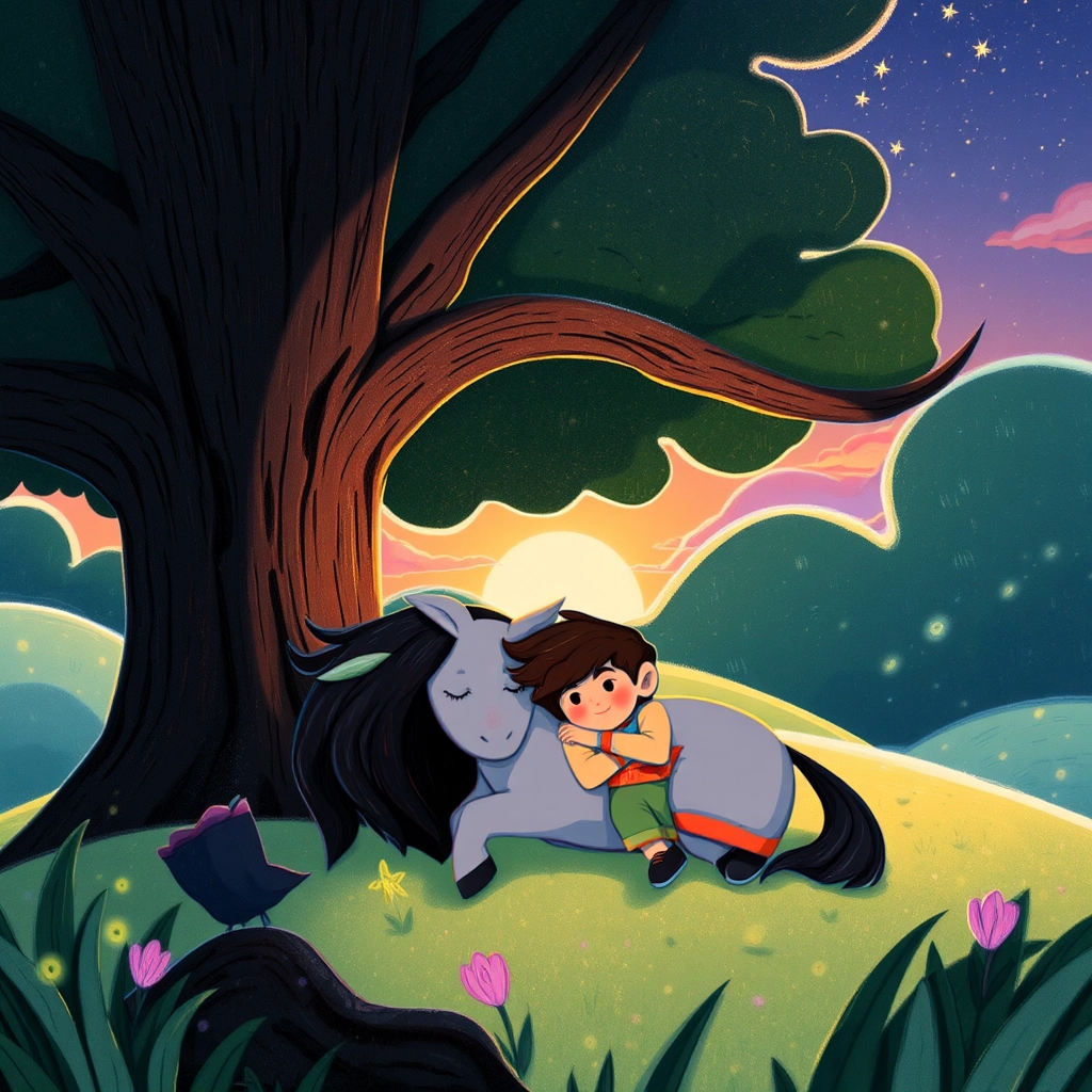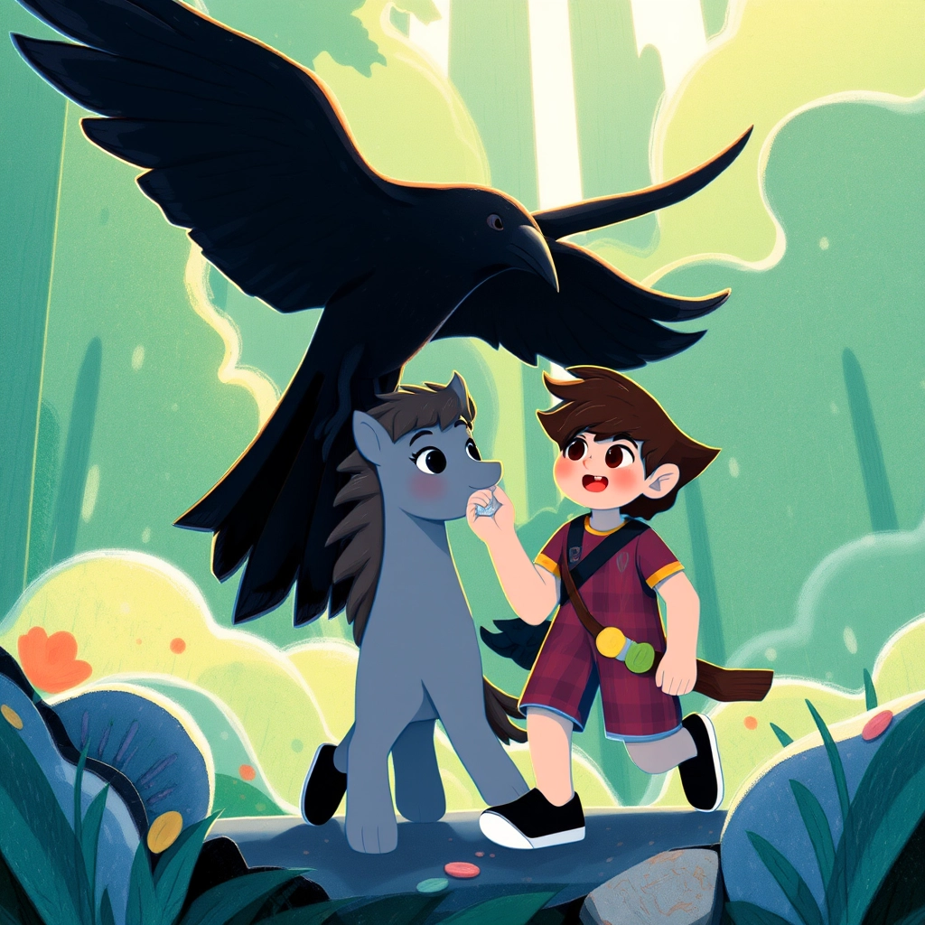 On a sunny morning in Meadowville, [Rosey](SGL37DFC) the pony, with her shimmering grey coat, trotted playfully around the field. Her best friend, [Ross](9VCWSB6J), a cheerful 5-year-old with dark brown hair, ran beside her, giggling and trying to keep up.