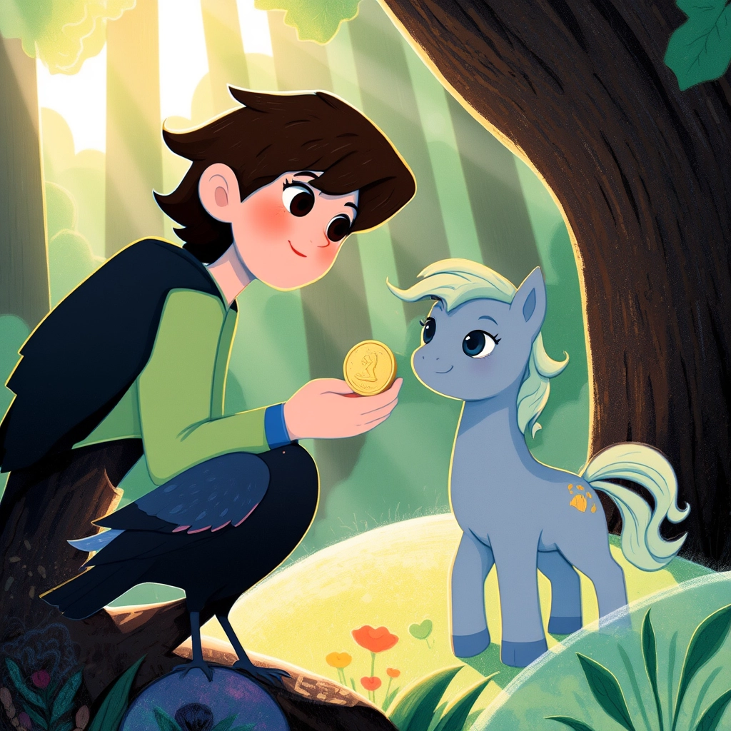 [Ross](9VCWSB6J) smiled kindly. 'We didn’t mean to take your coin,' he said, handing it back to the raven. The raven tilted its head, surprised by [Ross](9VCWSB6J)’s honesty.