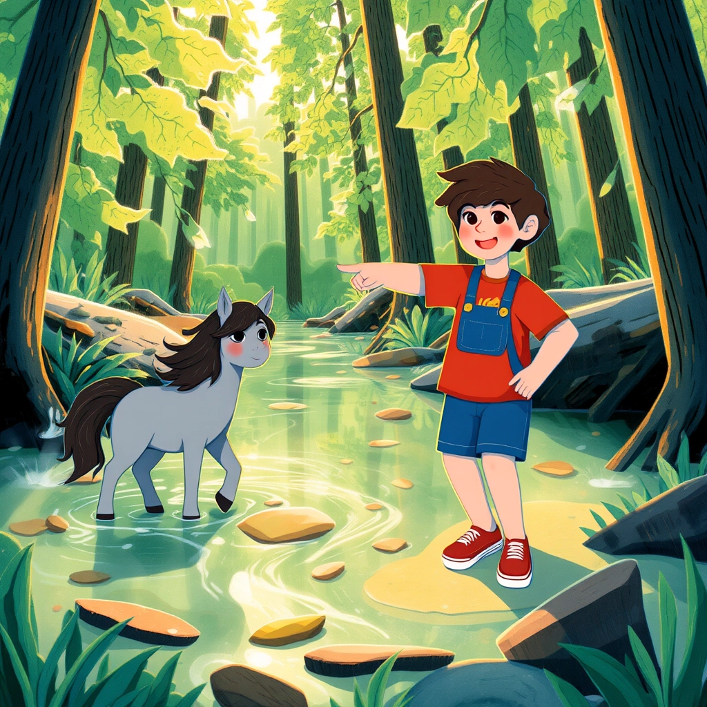 One day, [Ross](9VCWSB6J) had an idea. 'Let’s go explore the creek!' he said excitedly. [Rosey](SGL37DFC) neighed in agreement. The two friends dashed off toward the sparkling water, their favorite adventure spot.