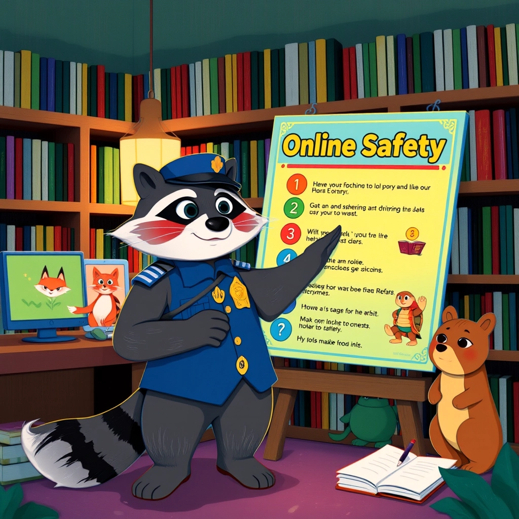 'Now let's talk about staying safe online!' [Rowdy](WCZNM7XF) said. 'Never share personal information, and only visit safe websites.' The animals listened carefully, nodding their heads.