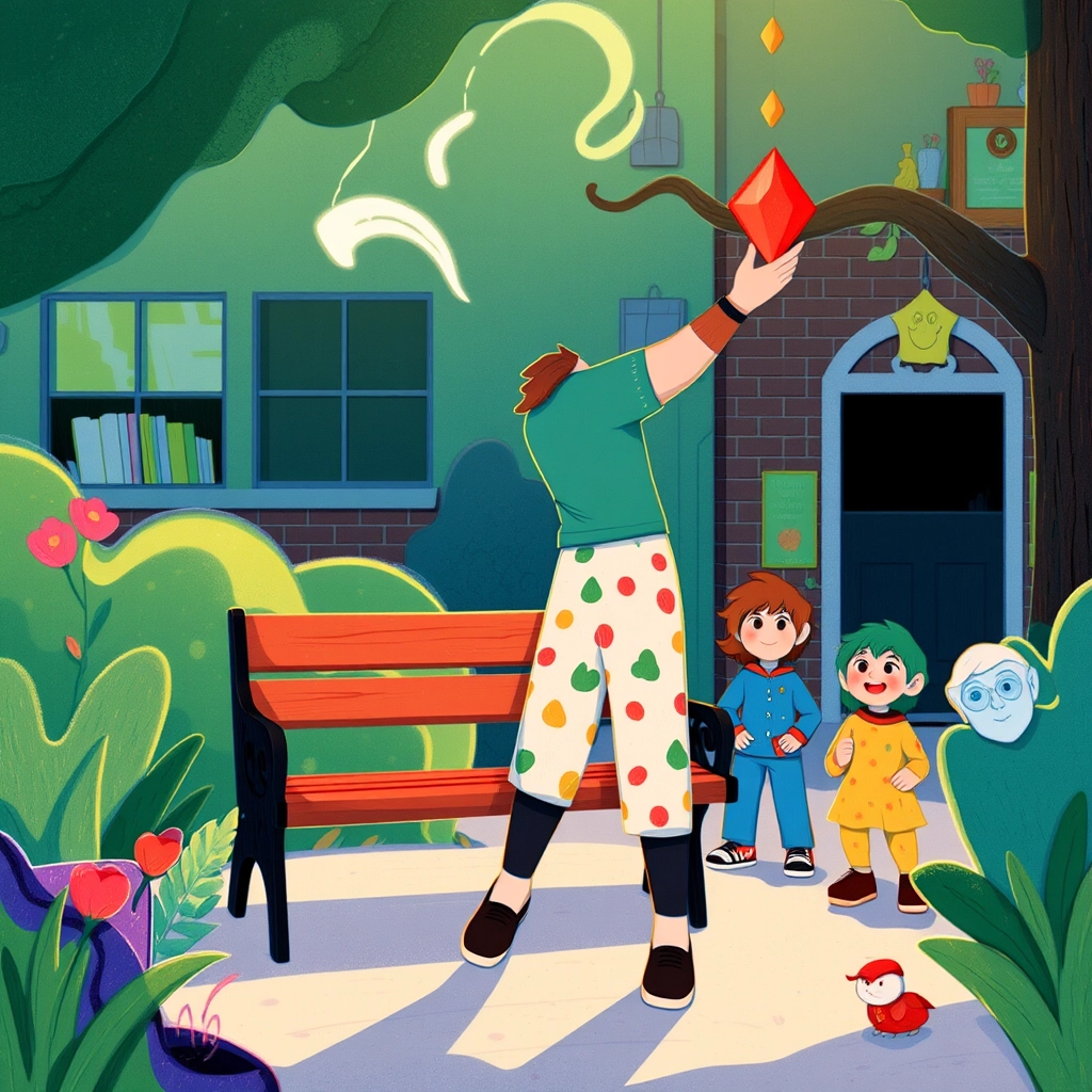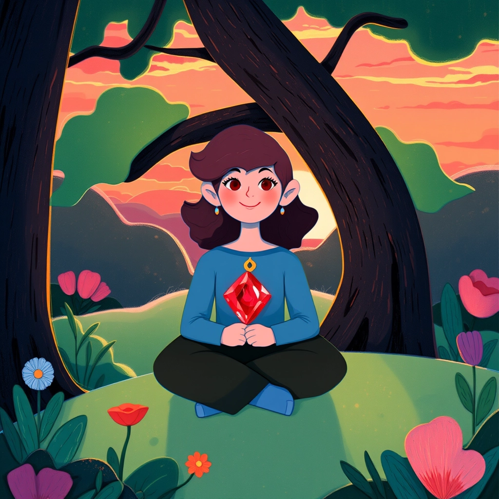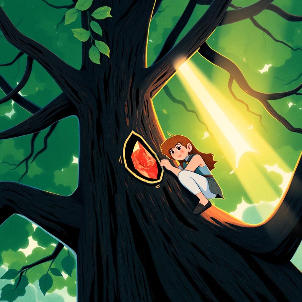 One afternoon, Ruby climbed her favorite tree to think. This time, she wasn’t wearing a dress. She wore her trusty overalls and felt more like herself. When she reached the top, she spotted a shiny stone wedged in the bark—a deep red stone, just like her name! 'Wow,' she whispered. 'It’s a ruby!'