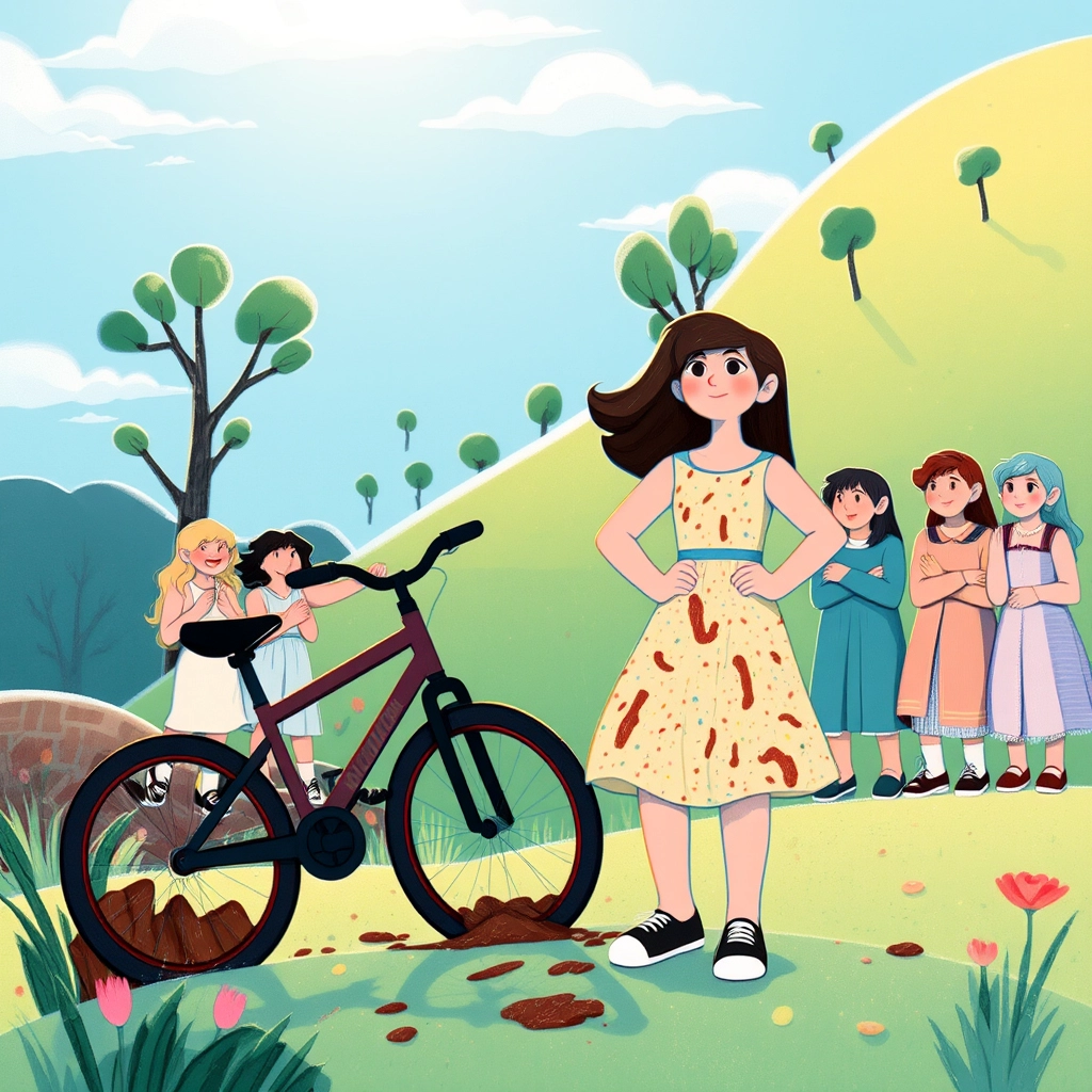 At the bottom of the hill, Ruby’s dress was covered in dirt, and she was grinning ear to ear. 'That was amazing!' she said, holding up a fist in triumph. But some kids pointed and chuckled. 'You ruined your dress, Ruby!' one of the girls said. Ruby’s grin faltered for just a moment, but she thought, 'What’s more fun—a boring, clean dress or an epic bike ride?'