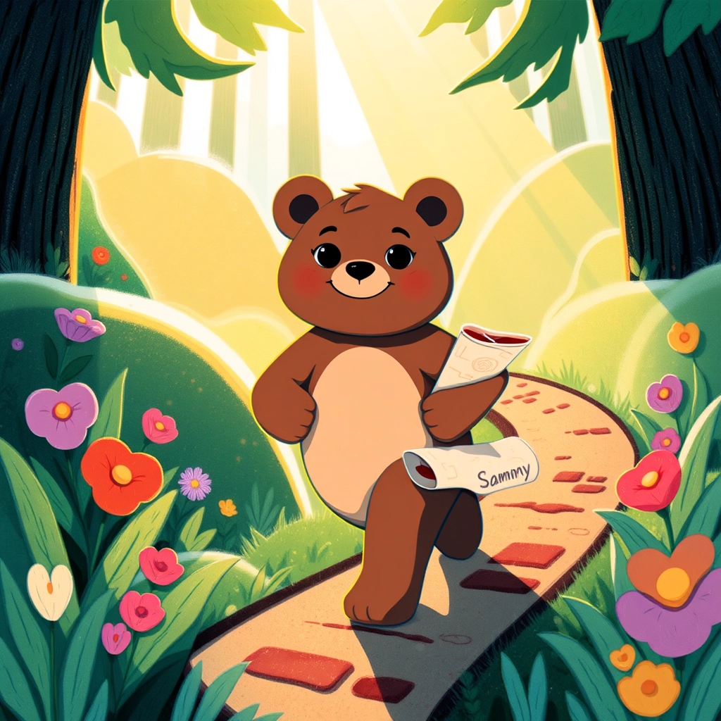 One day, [Sammy](CZDP5KHC) decided he was ready to search for the Golden Honey Pot. With a small map and a brave heart, he said goodbye to his mother and set off down the winding forest path.