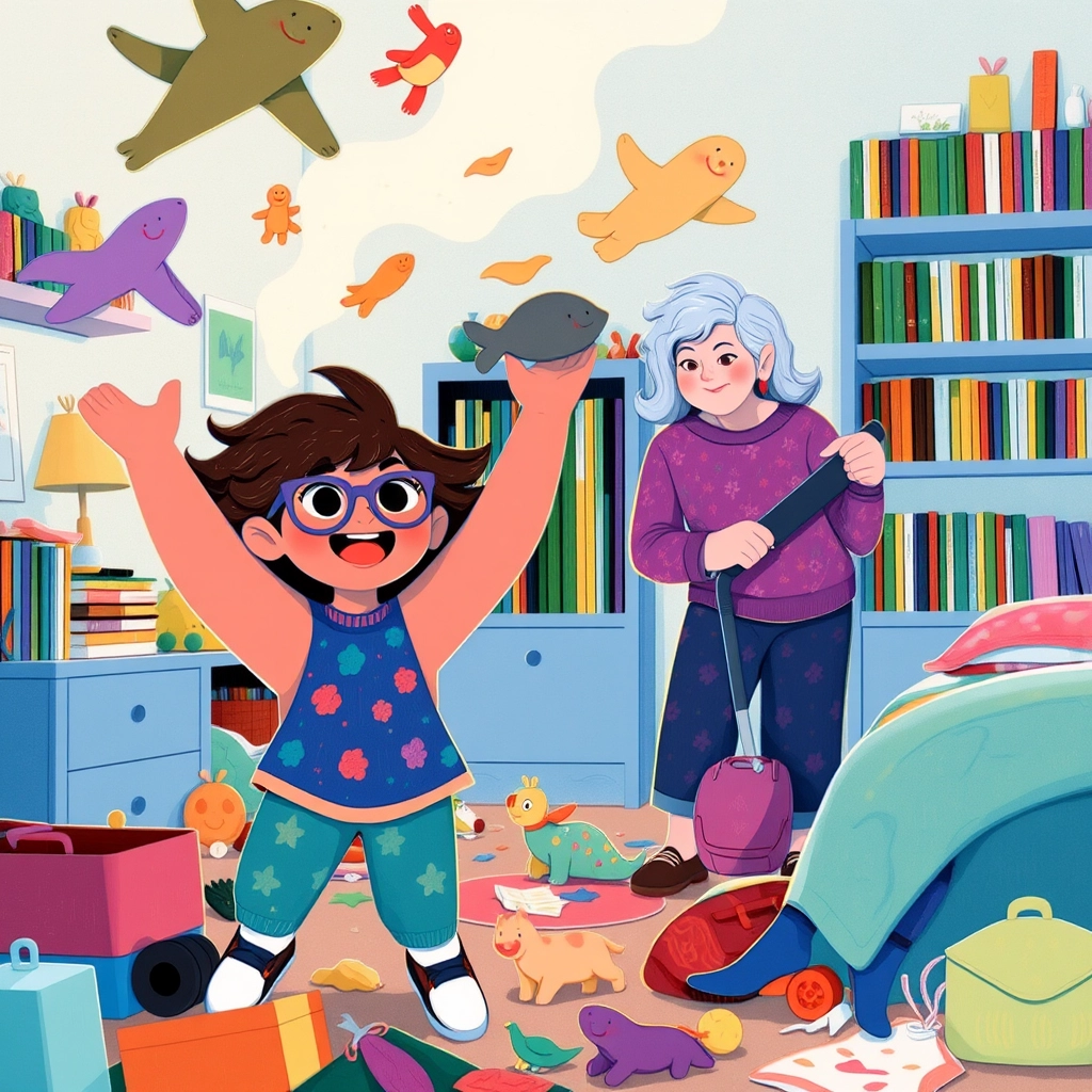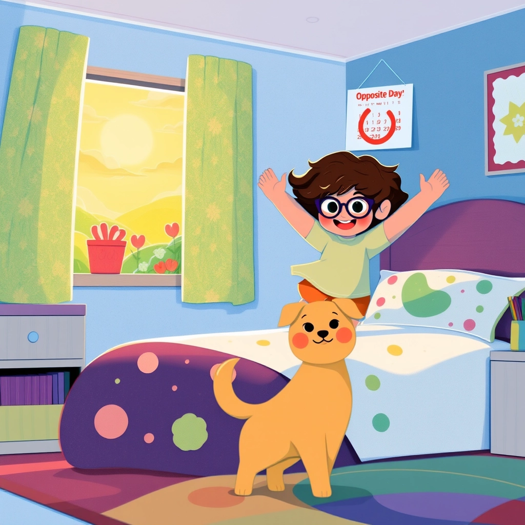 One morning, [Sarah](R97YPT37) woke up with a mischievous grin. 'Today will be Opposite Day!' she announced to her pet dog, [Mango](Z2LFKM2S), who wagged his tail in agreement.