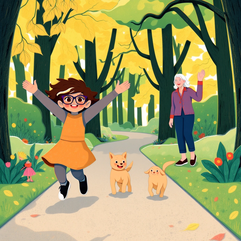 As the sun set, her mom said, 'It’s time to go home.' But [Sarah](R97YPT37) shouted, 'Not yet!' and skipped backwards down the path with [Mango](Z2LFKM2S) happily barking.