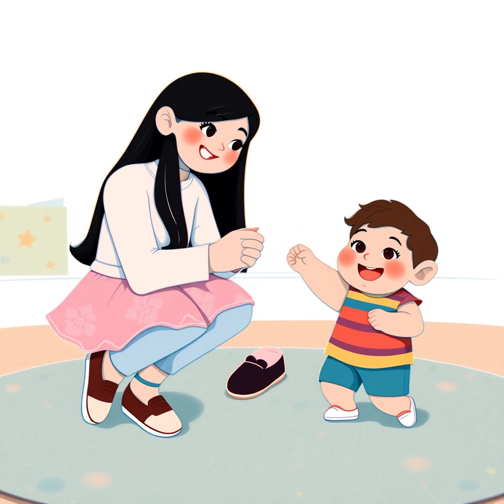 “Come here. I’ll help you,” [Shenna](6QSZMFTV) said warmly. She held both of [Shervin](62TFLJ32)’s hands and helped him stand upright. Together, they took slow, wobbly steps in a tiny twirl.