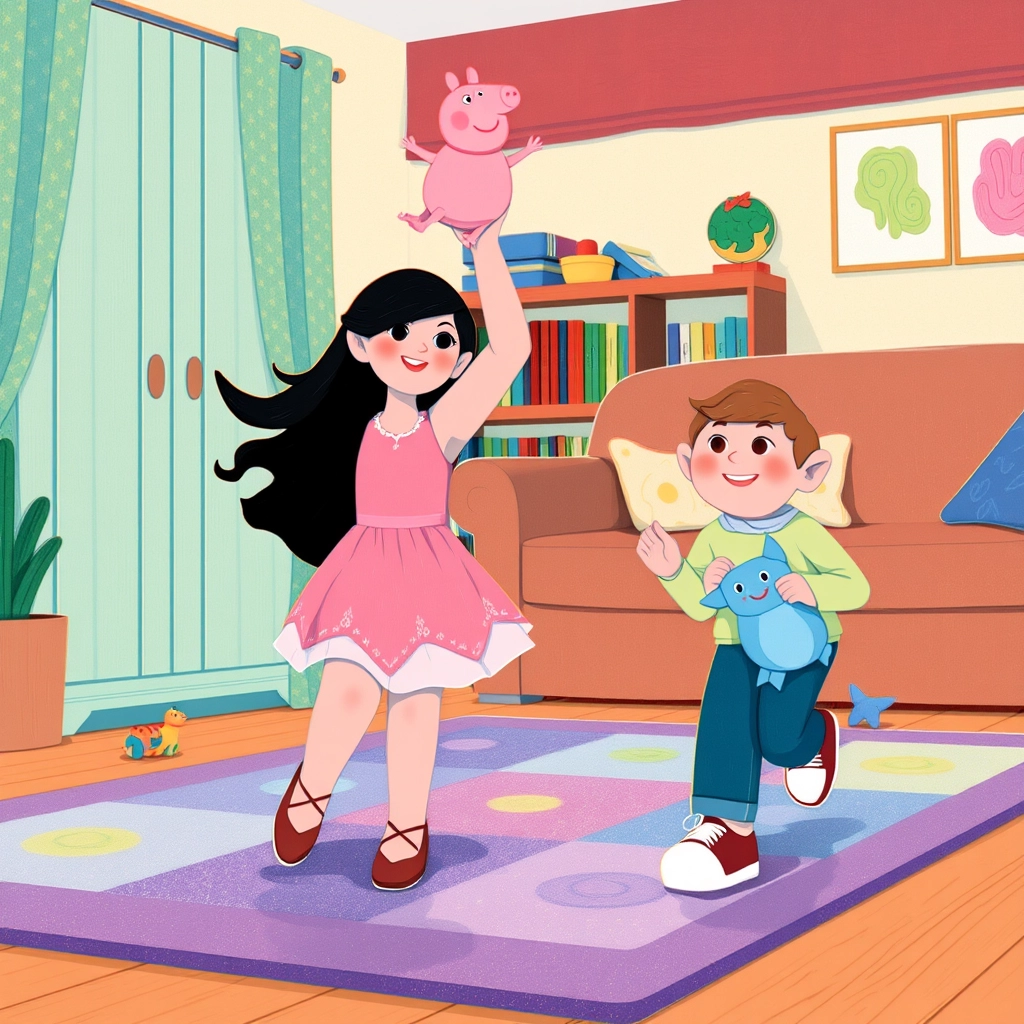 [Shenna](6QSZMFTV) danced to the gentle music, lost in her world, while nearby her one-year-old brother [Shervin](62TFLJ32) clapped his chubby hands with delight and waved his Bluey plush toy.