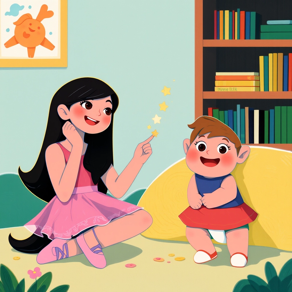 “Do you like my dance, [Shervin](62TFLJ32)?” [Shenna](6QSZMFTV) asked. [Shervin](62TFLJ32) squealed with glee and bounced on his bottom, cheering her on with his bubbly laughter.