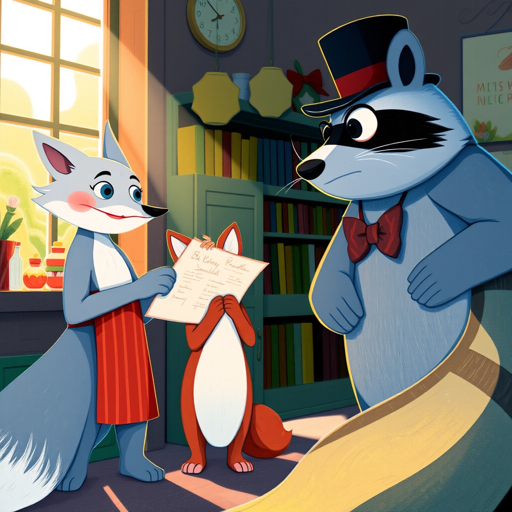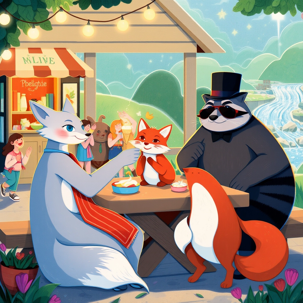 One sunny day, a fancy car pulled up outside the shop. Out stepped a well-dressed raccoon named [Mr. Pellington](KCD9FNFT). He ordered a cone of 'Golden Caramel Swirl' and found it so delightful that he decided to chat with [Silver](33MMJ6XC) and [Ruby](N7PJXQ6F).