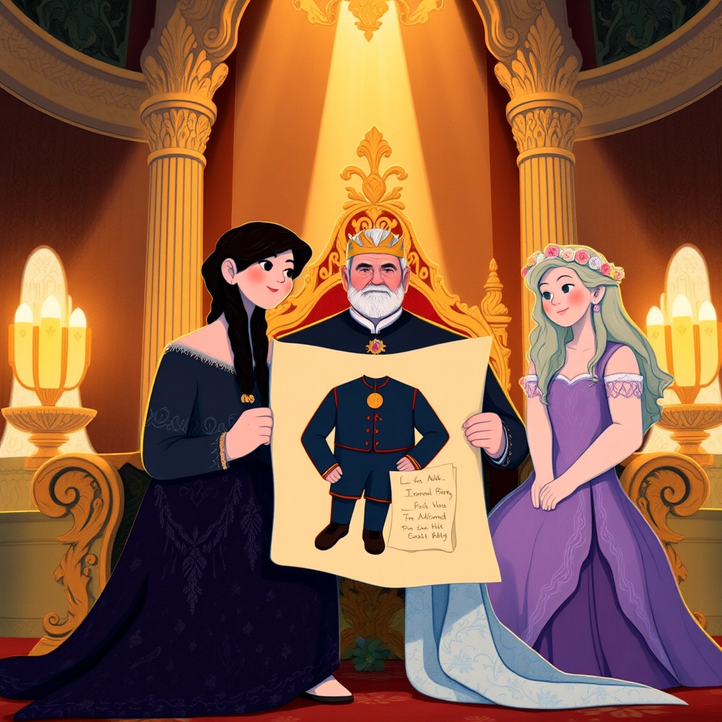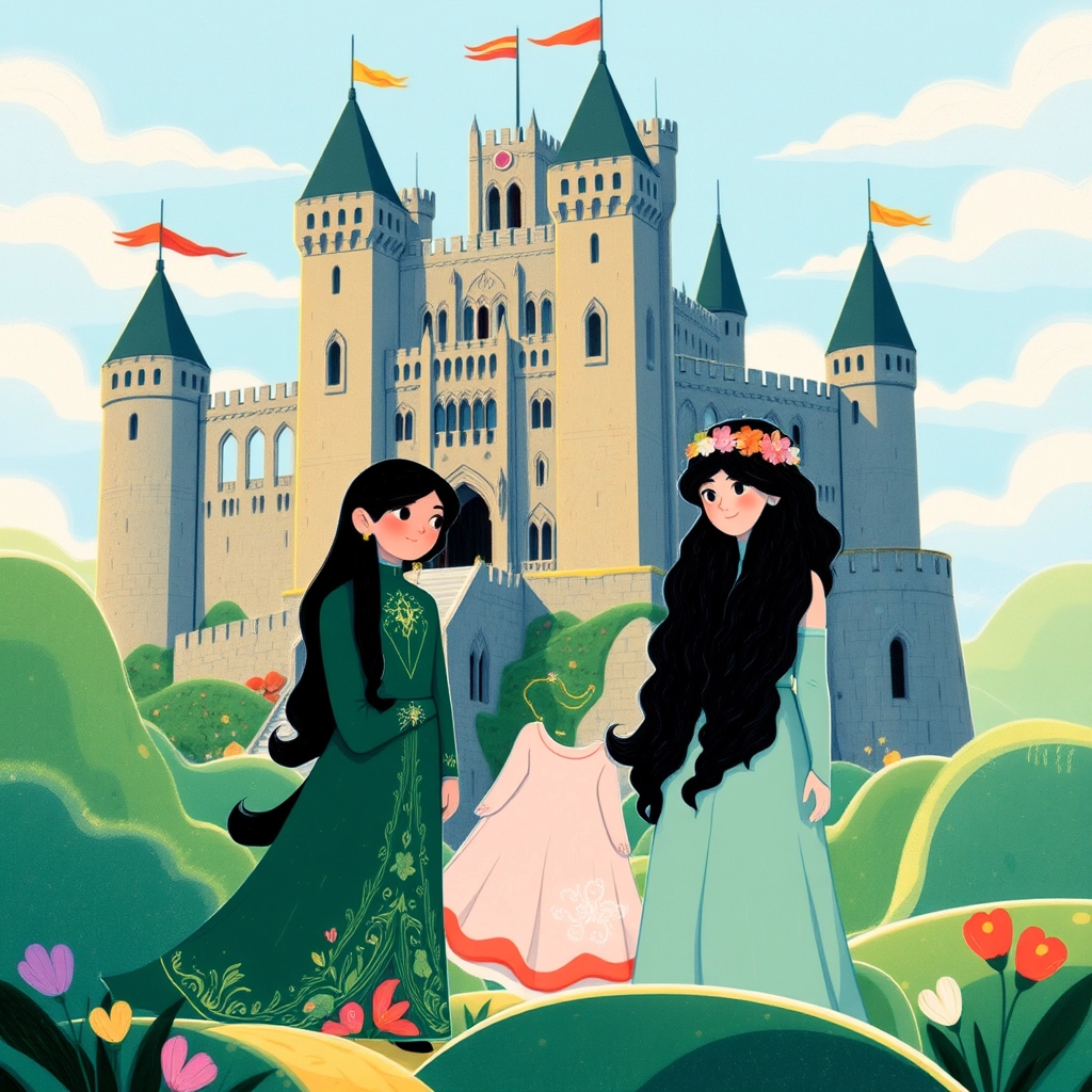 Once upon a time, in a grand castle surrounded by rolling hills and glittering streams, there lived a king and his two daughters. The older daughter, [Elara](3M6CLF3Q), was known for her greedy nature and haughty demeanor, while the younger daughter, [Lilia](KG6GYMMG), was beloved for her kind heart and generosity.
