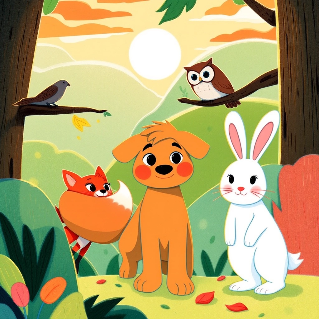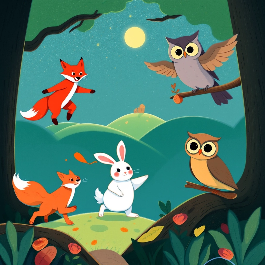 The fox suggested playing tag, the rabbit wanted to collect carrots, but the owl had an idea that [Benji](9QXR4GGB) loved.