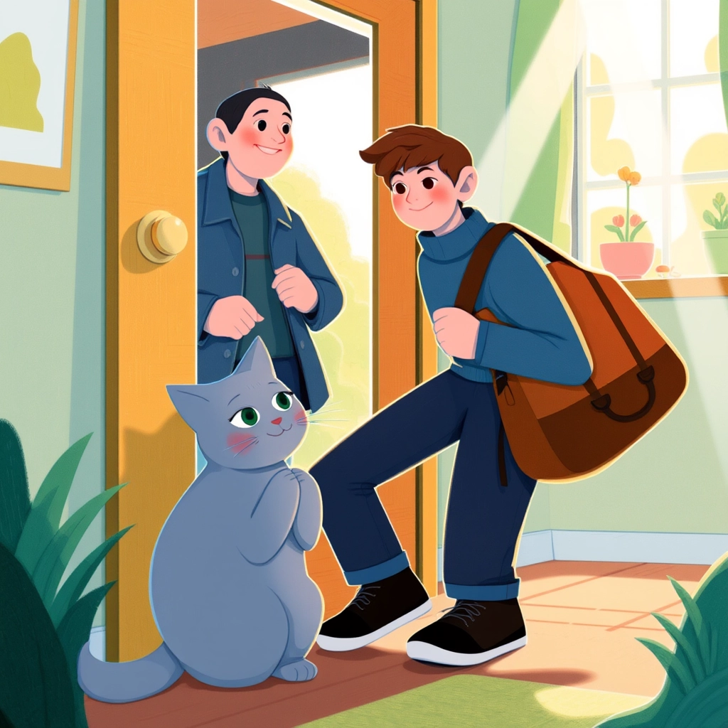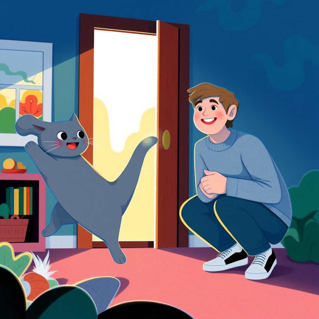 The door opened, and there was [Max](DVHHCQ9P)! [Smokey](F3N6PQZ7) sprang to his feet in excitement, his fluffy tail flicking back and forth like a feather duster.