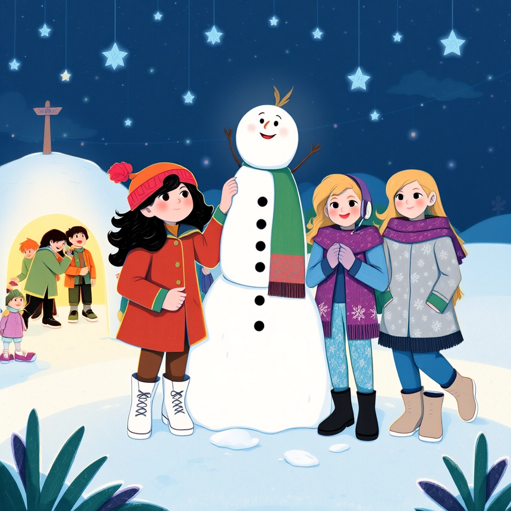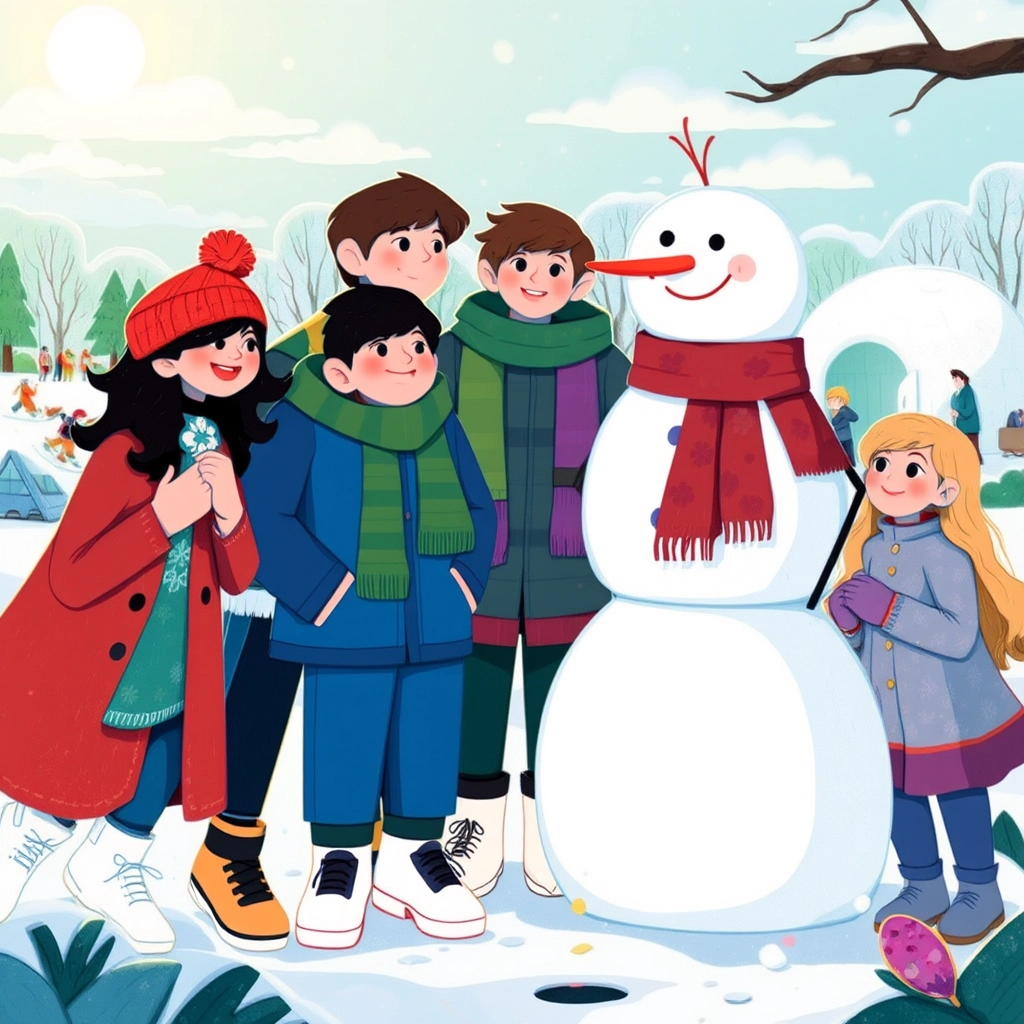 Finally, they completed the snowman, complete with a carrot nose, coal buttons, and a funny top hat they found in [Max](4GNKNPZS)’s garage. "Frosty Fred!" suggested [Ella](SN9YLRYH), and everyone agreed. But trouble began when Frosty Fred started leaning dangerously to one side! What could they do to fix it? [Lily](7ZPSCZ9F) had an idea.