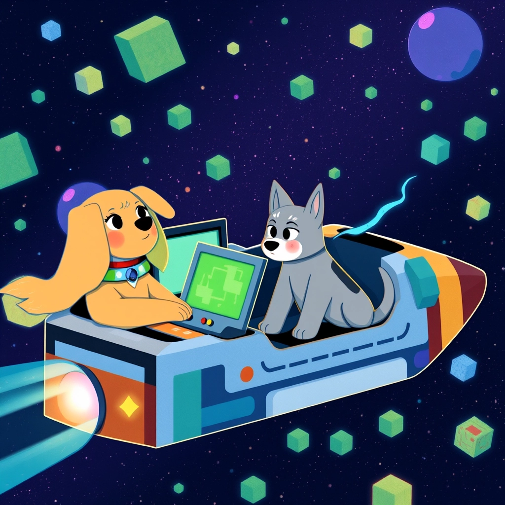 Once upon a time in a galaxy made of Minecraft blocks, there lived two extraordinary space-exploring dogs named [Astro](77ZDLW6H) and [Pixel](CG94JB3G). They had shiny silver space suits and loved flying their spaceship, the Stardust Rover.