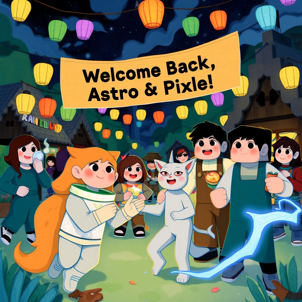 Back in the galaxy, [Astro](77ZDLW6H) and [Pixel](CG94JB3G) handed the Star Crystal to [Rowan](5DQPYJ74), who placed it gently back into the sky. Instantly, the universe lit up with bright, colorful stars again!