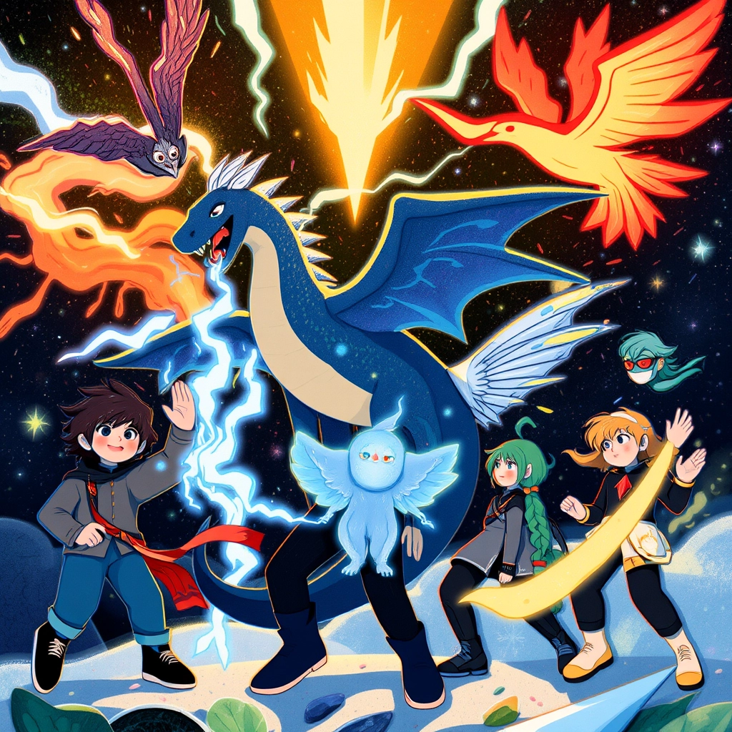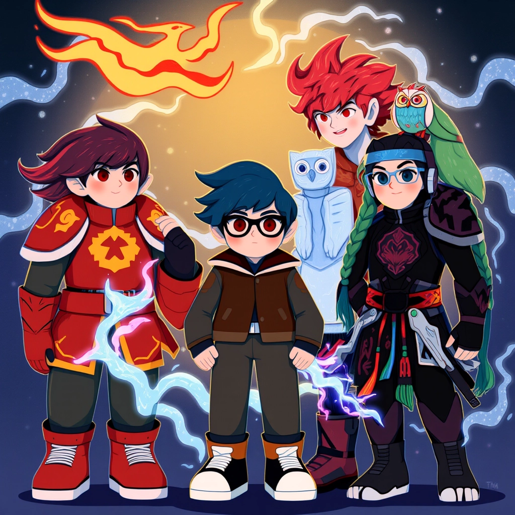 [Megan](PNT6H2DL) met her new allies one by one. First came [Kazuki](WRNC363C), the fiery rival with crimson hair and a blazing phoenix spirit. Then there was [Luna](Q4VRTHZS), the quiet ninja fan with icy-blue hair and an arctic wolf spirit. Finally, [Yasmin](74CVW6PL), a tech-savvy strategist with bright green braids and a glowing mechanical owl. Together, they'd train to stop the Shadow Beasts.