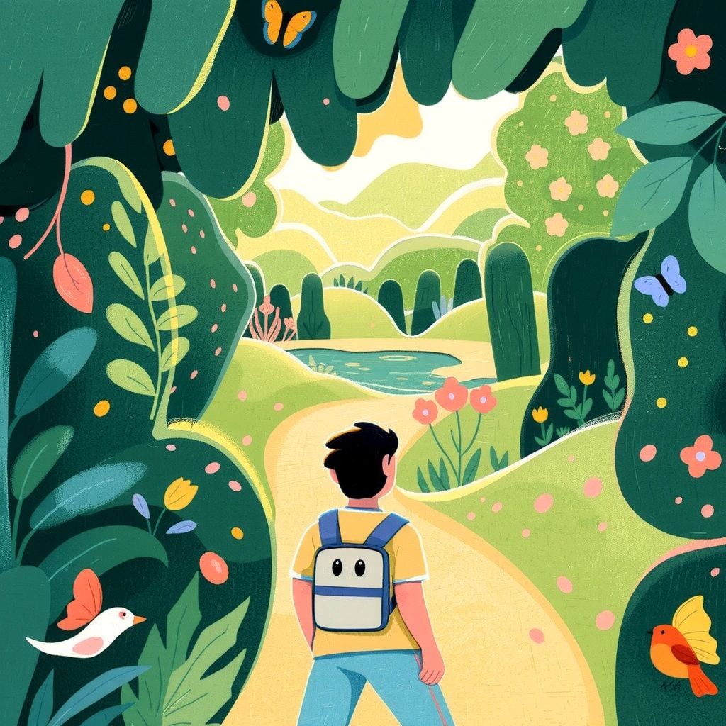 Together, they ventured deeper into the garden where the trees pointed towards a hidden path, leading to a shimmering pond.