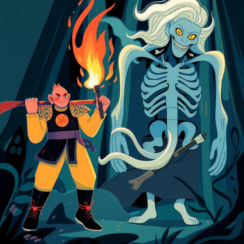 [Sun Wukong](5YDF55PT) warned [Tang Seng](P7NVF56B), “Stay away from her!” The demon's smile faded, revealing her true form—a frightening figure with bony fingers and glowing eyes. [Sun Wukong](5YDF55PT) stood ready to protect his friend.