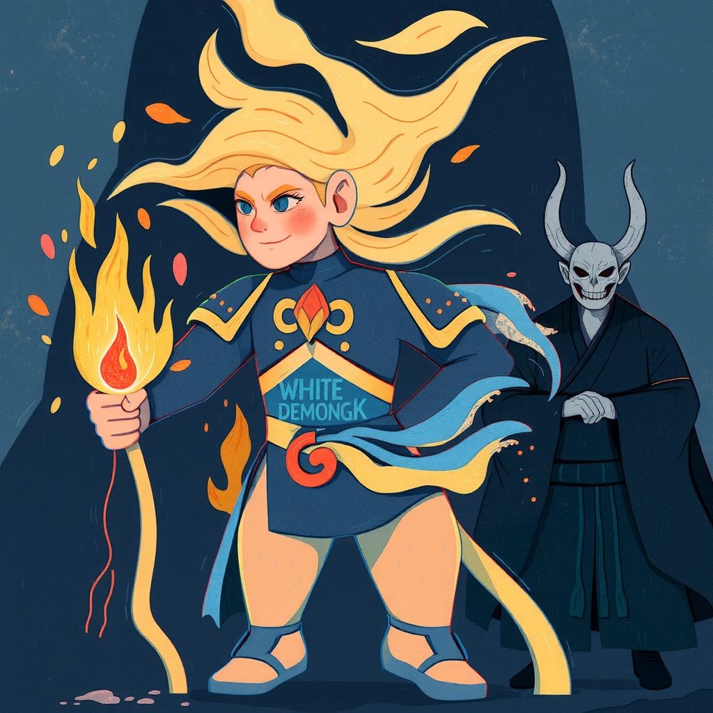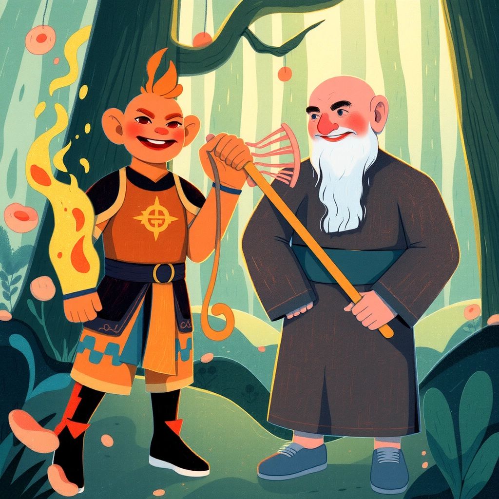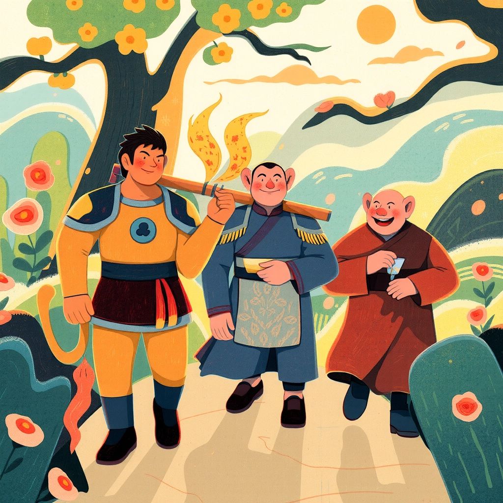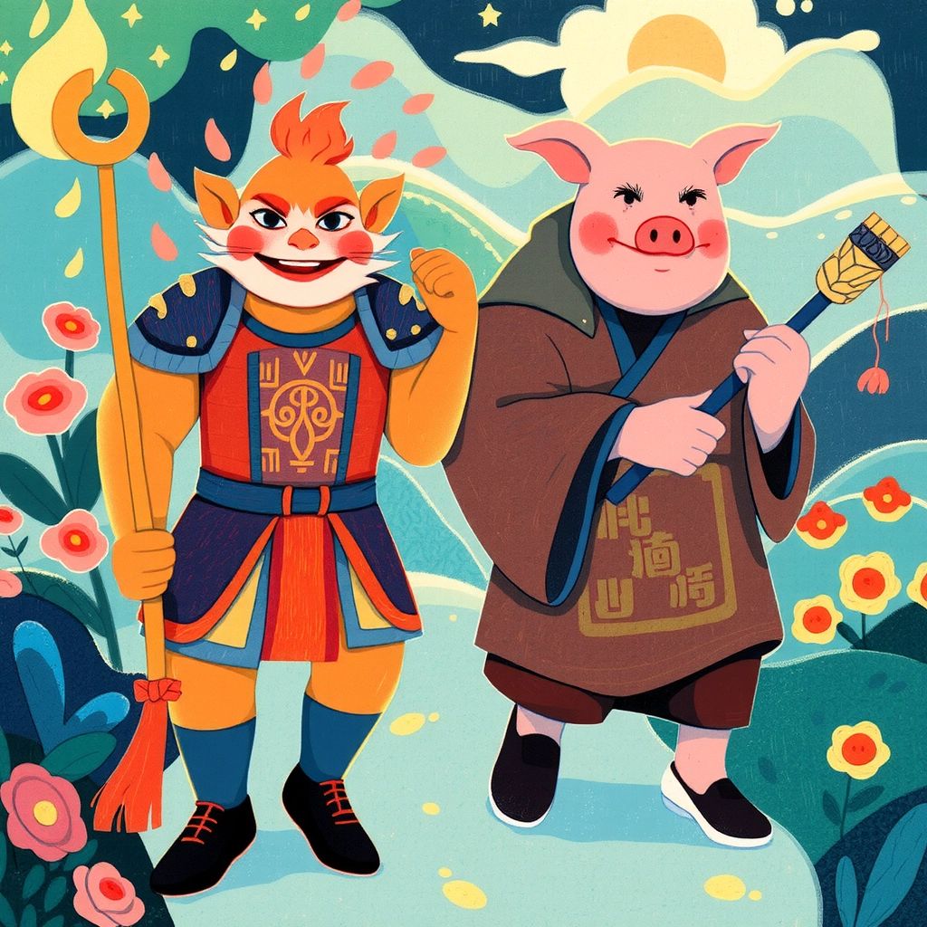[Sun Wukong](5YDF55PT) traveled with a kind monk, [Tang Seng](P7NVF56B), who sought sacred scriptures to bring peace. Their companion, [Zhu Bajie](F54MTYWM), the jolly pig, carried a sturdy rake. Together, they faced challenges on their journey through enchanted lands.
