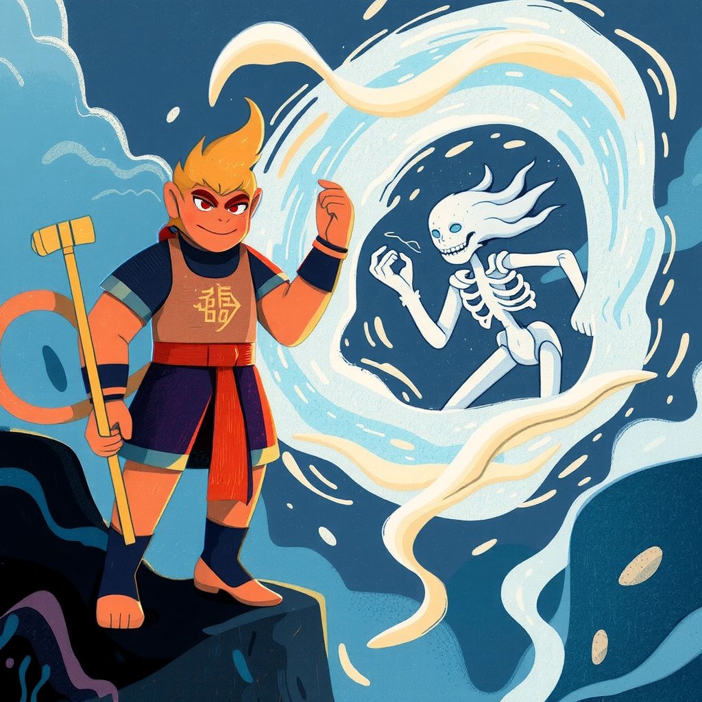 Suddenly, the beautiful [White Bone Demon](3M3PQQH3) appeared, pretending to be a lost traveler. Though her voice was sweet, [Sun Wukong](5YDF55PT) wasn't fooled. He knew she planned to harm his friend, [Tang Seng](P7NVF56B).