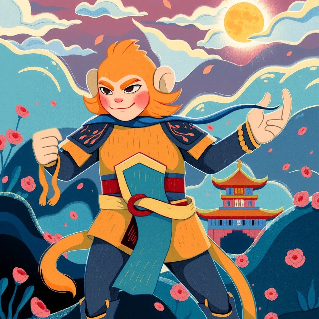 In ancient China, the mischievous and bold [Sun Wukong](5YDF55PT), the Monkey King, was known for his magical powers and adventurous spirit. He had golden fur and wielded a magical staff that could change size at will. Today, he was on a sacred mission with his friends.