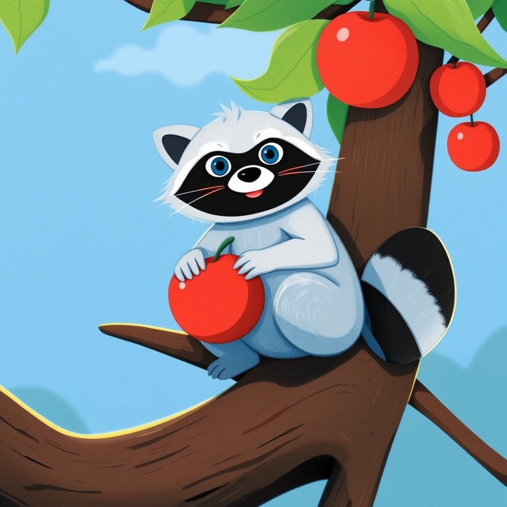 [Max](76FB5PTH) the mischievous raccoon, with his silvery fur and black mask, climbed up the tallest apple tree to pick a ripe, red apple.