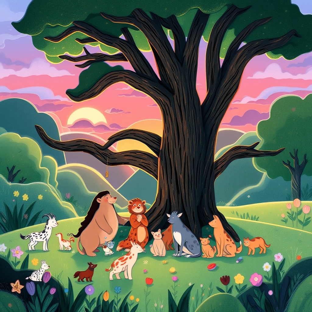 The animals cheered, sharing the seed as they settled under the sycamore tree, the golden sun setting and painting the sky in glorious hues of pink and orange.