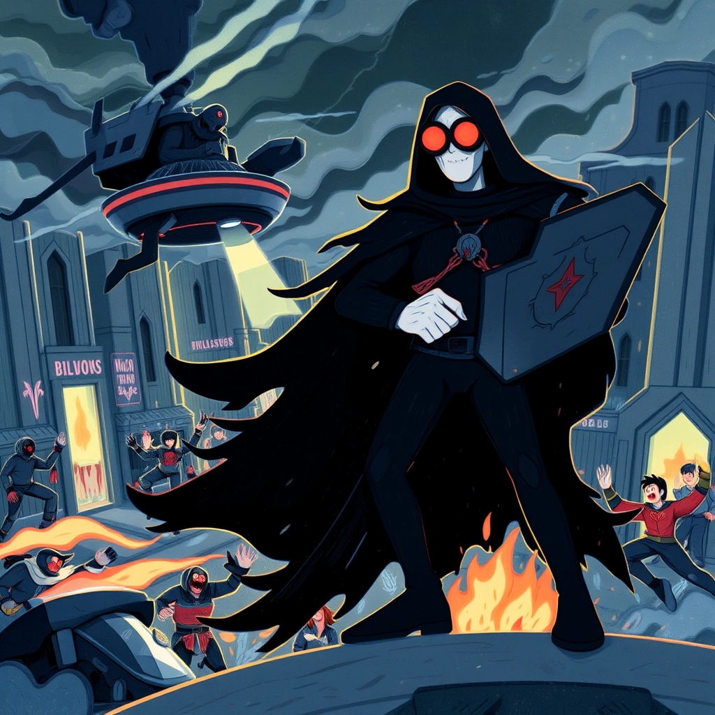 Meanwhile, in the city, the evil [Dr. Shadow](W2NNZ5X5), a villain with a cloak made of darkness and glowing red goggles, unleashed his army of shadow robots to take over the world!