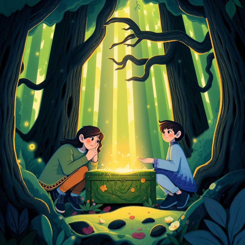 One day, as they explored the woods behind their house, they stumbled upon a mysterious glowing chest buried under the roots of an ancient tree.