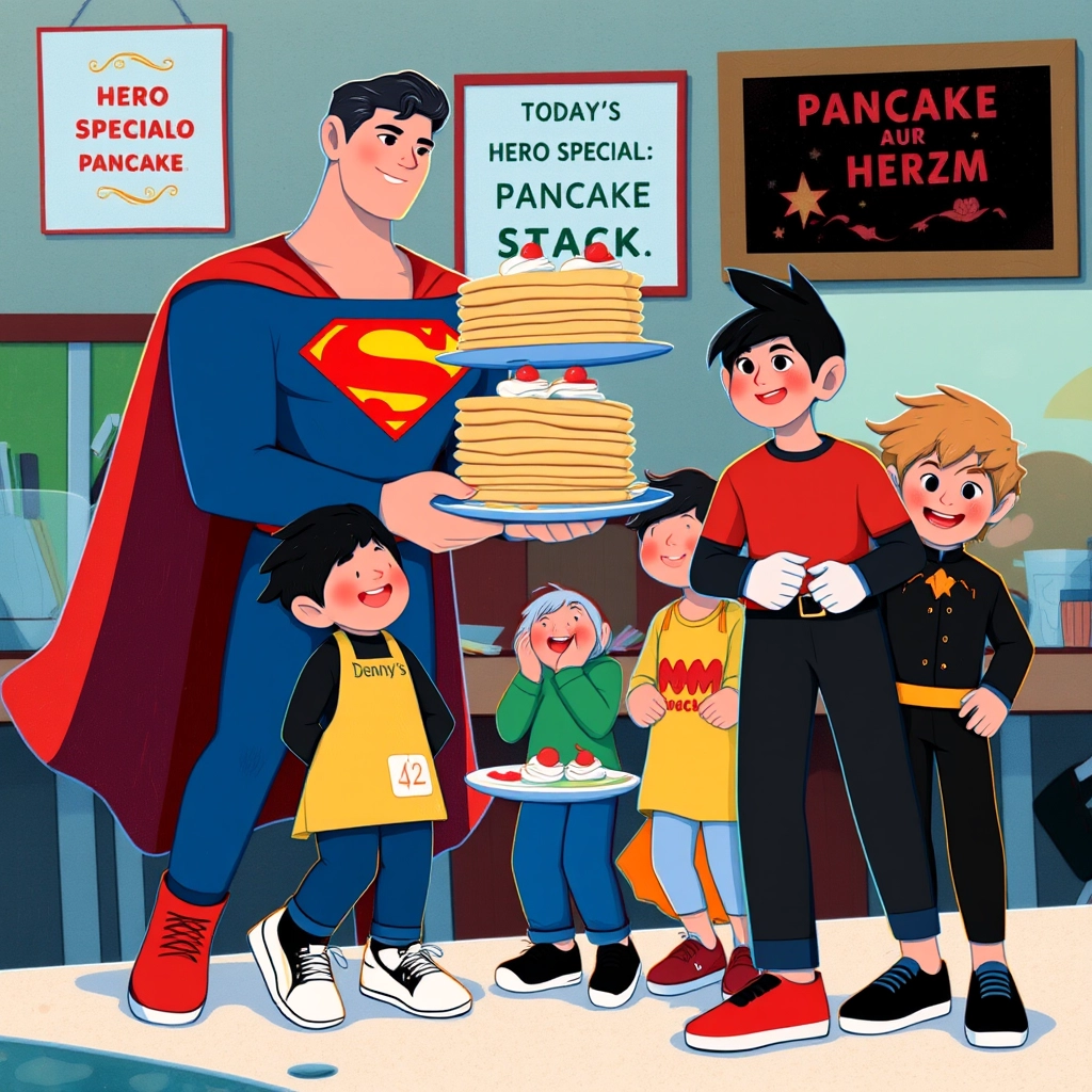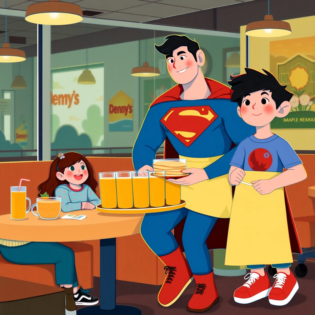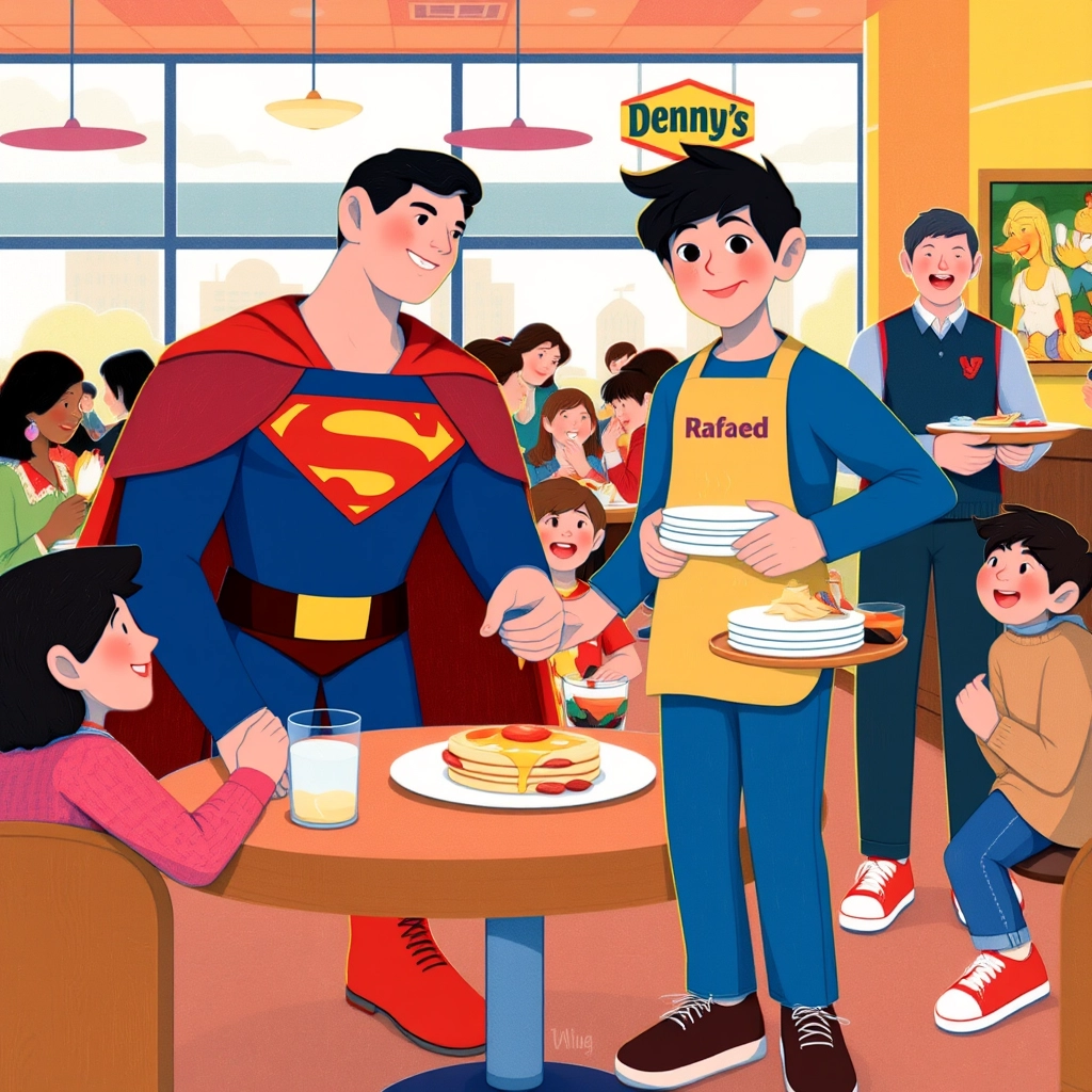 It was a sunny morning, and [Superman](5JB97BVR) decided to try something new—working a shift at Denny's! With his trusty sidekick [Rafael](4FT5QH2W) by his side, the two were ready for an exciting day.