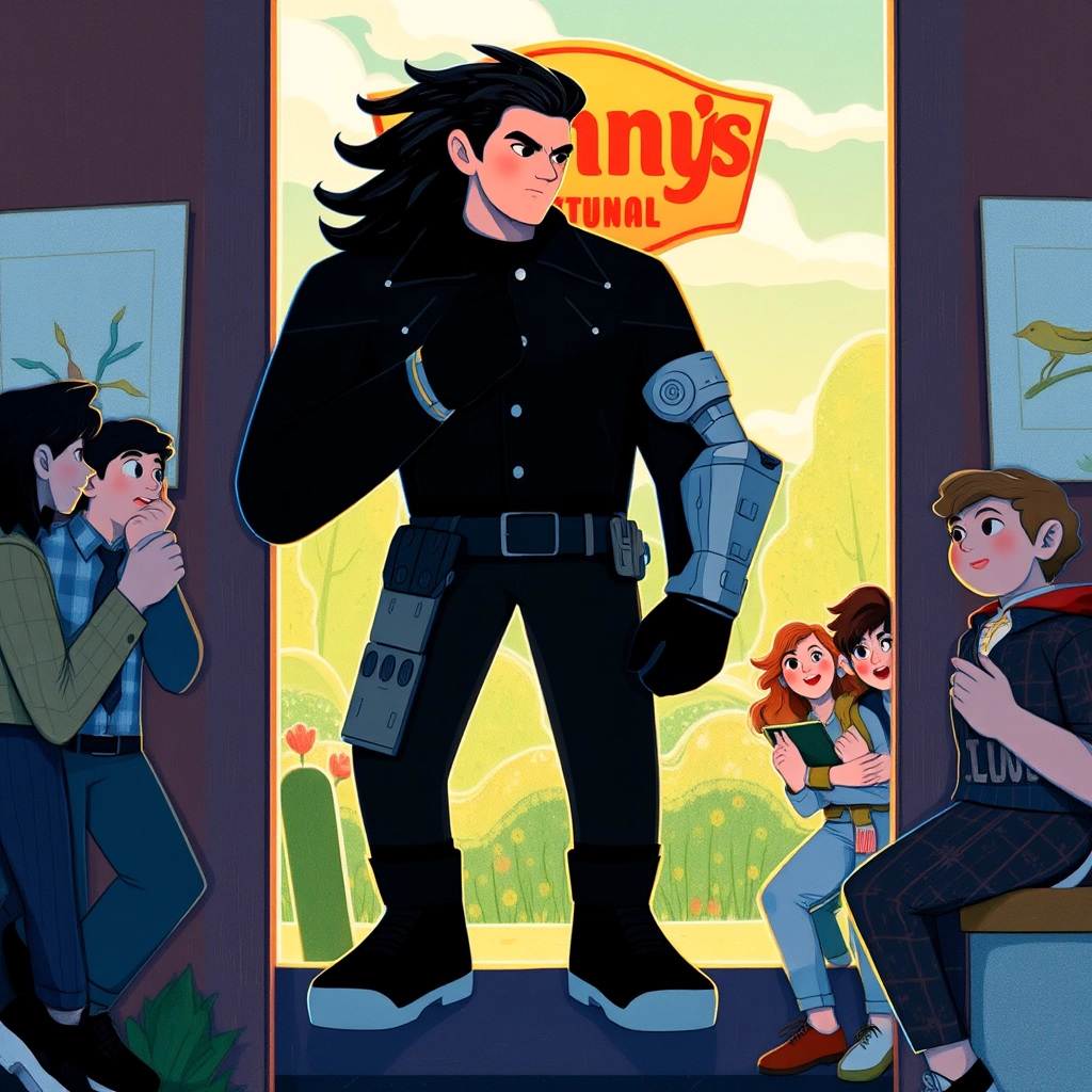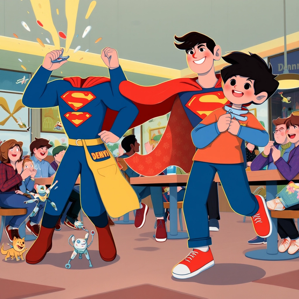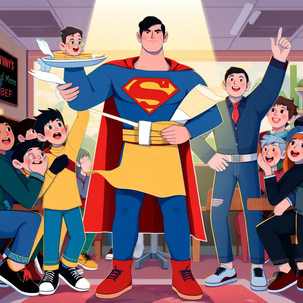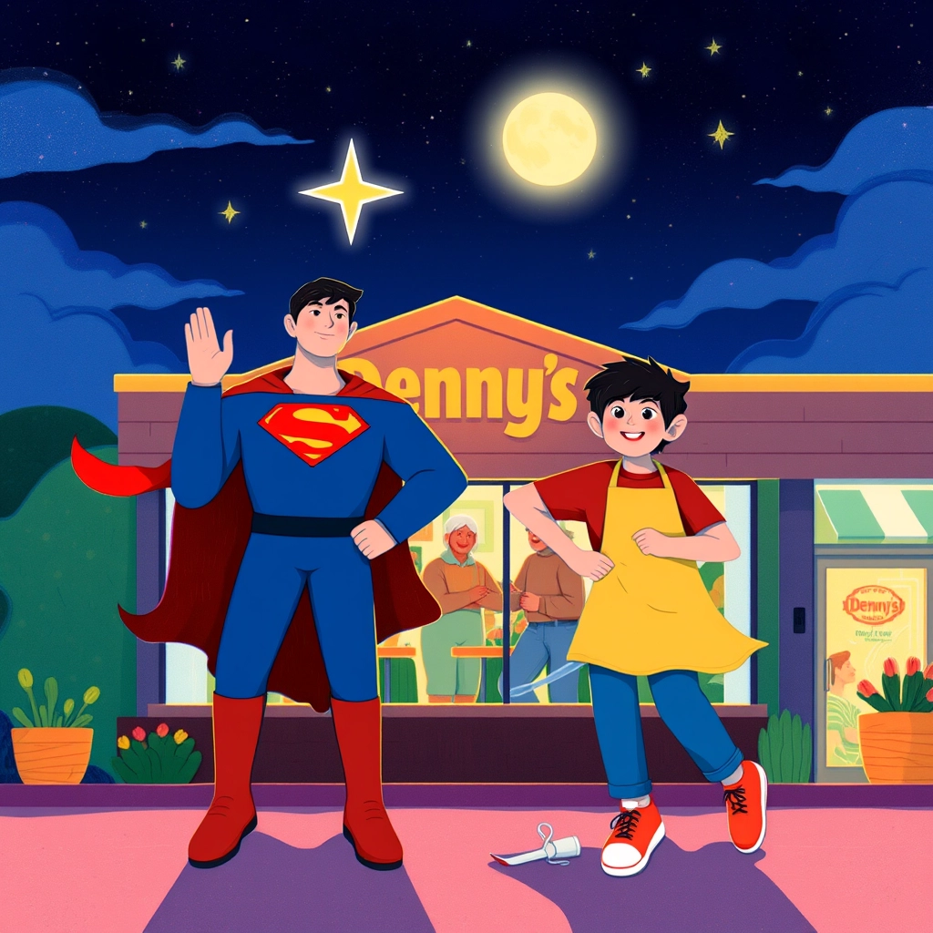 It was a sunny morning, and [Superman](5JB97BVR) decided to try something new—working a shift at Denny's! With his trusty sidekick [Rafael](4FT5QH2W) by his side, the two were ready for an exciting day.