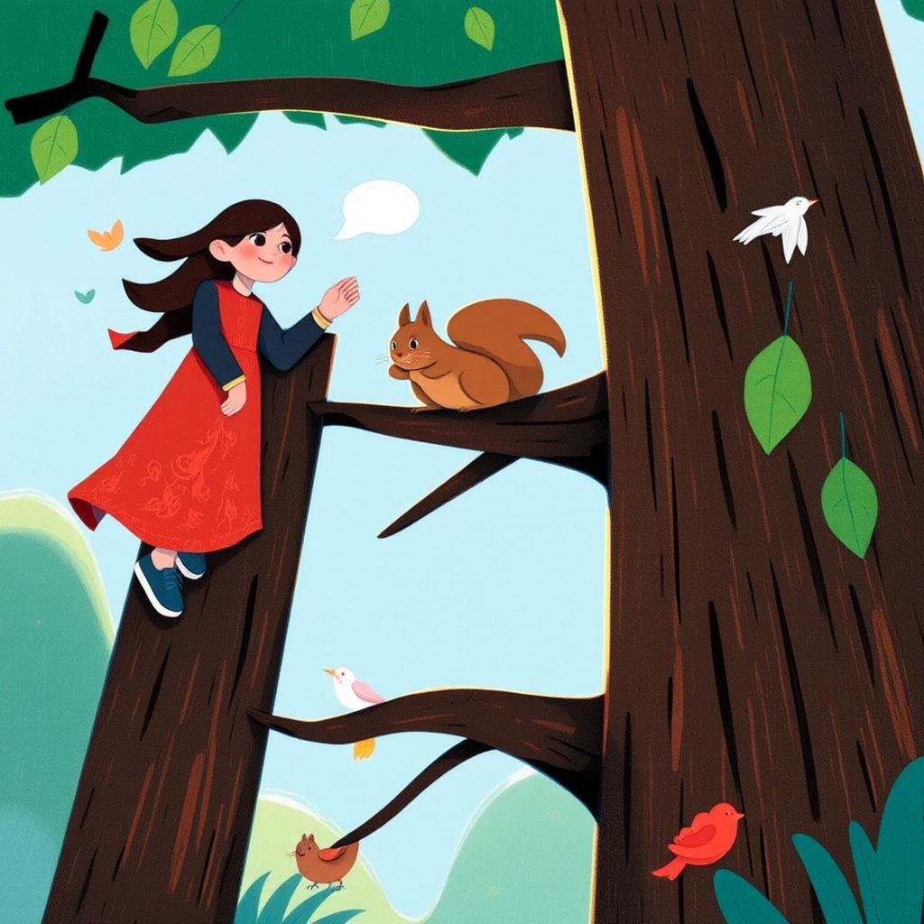 تسلقت أسيل الشجرة وشاهدت السنجاب. قالت له: 'أيها السنجاب، هل رأيت دراجتي؟'