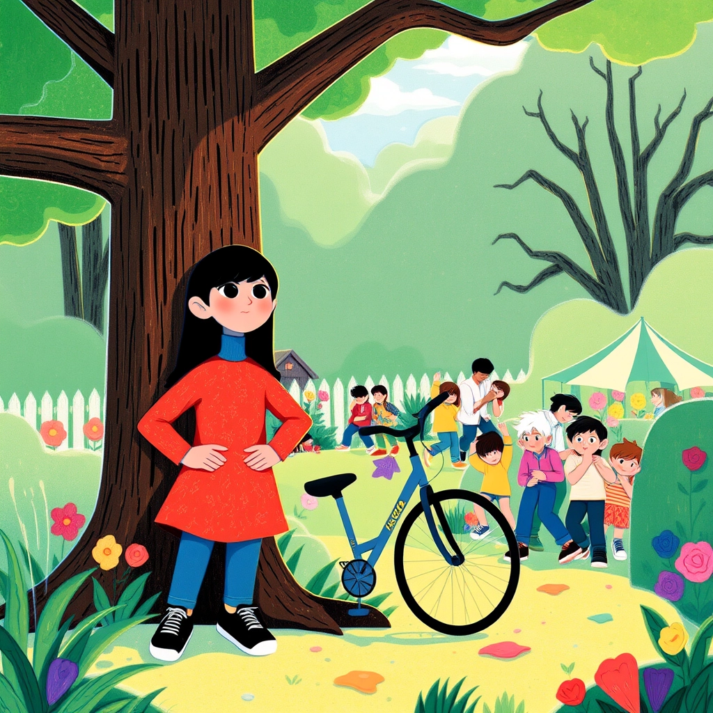 بعد مدة، عادت أسيل إلى الشجرة ولم تجد دراجتها! شعرت بالقلق وبدأت تبحث حولها.