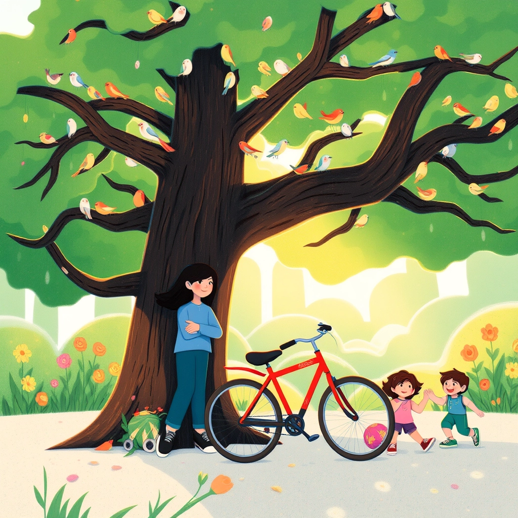 ركنت أسيل دراجتها تحت ظل شجرة كبيرة مليئة بالطيور، وذهبت لتلعب مع الأطفال.